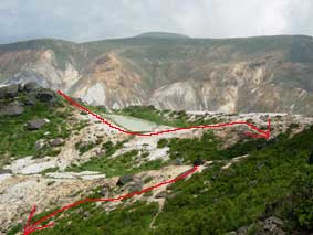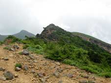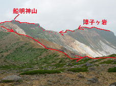 10:35 標高1620m 赤留川源頭の池通過。 ここは雪渓の溶けた溜まり水と他のサイトに記されていました。 右側から回り込むように進みます。 船明神山方向へは一度右に回り込んでから,尾根に出てきます。(赤ラインがルートです) この写真撮影の場所まで来て,方向感覚がおかしくなり,私が「あの池のあるコースは何処に向かうのかな。」と大ボケ発言をして,パートナーの失笑と嘲りを受けました。「チョー,ハズカシィース」 間もなく船明神山です。奥には安達太良山が見えています。 10:52 標高1660m 船明神山到着 小休憩。 10:58 出発。 休憩時間6分 写真撮影の後水を飲んで出発しました。 11:02 標高1605m 石筵と安達太良山の分岐通過 壊れた看板が立っています。 安達太良山には尾根から左に外れ,ザレの急斜面を少し下ります。 石筵へは尾根をそのまま進みます。展望がきかないと,この尾根を石筵方向へ,進んでしまいそうなので要注意です。 ここから安達太良山の分岐までは,安達太良山〜鉄山の眺めが素晴らしいです。 感動の連続です。 11:19 標高1660m 鉄山,安達太良,船明神分岐(牛の背)通過。 安達太良山にはたくさんの人が見えています。 「今日の牛の背は珍しく風がない。そよ風より少しある程度だ。風が気持ちいい。 このままの状態で風が納まっていてくれればいいな。」 牛の背の分岐が過ぎたところで,歩いてきた障子ヶ岩,船明神山を振り返りました。 11:32 標高1,680m 安達太良山乳首下通過。 人がゴチャゴチャいます。今から山頂を目指します。 11:34 標高1700m 安達太良山頂到着 休憩。 水飲み休憩です。 和尚山が見えています。箕輪山も見えています。通過してきた船明神山,障子ヶ岩も見えています。 今日はトンボが避暑に来ています。すんごい数です。キアゲハ蝶もとんでいます。パートナーが「キアゲハ,キアゲハ」と喜んでいます。 |