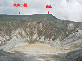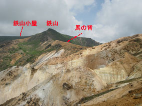 福島県 安達太良山 登山ルート;沼尻登山口〜障子ヶ岩〜赤留川源頭の池〜船明神山〜安達太良山〜鉄山〜胎内岩〜沼尻登山口 標高1,709m(鉄山) |