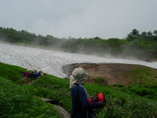 11:43 標高1,400m。 雪渓を渡ったところで休憩。 ここにはなんと,トキソウが群生しています。ビックリ。女性の一人とパートナーが写真撮りまくりで,食事を始めません。 私はさっさと食事を始めました。食事が終わってからゆっくり写真を撮りました。 雪渓からは水蒸気が立ち上がっています。 12:12 雪渓出発。 休憩時間29分。 12:53 標高1,120付近。 田子倉コースの写真撮影 天候が素晴らしい晴れになりました。「暑い!」 |