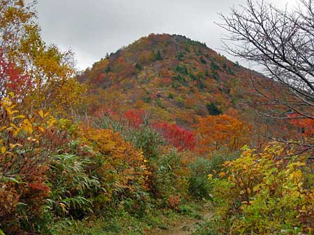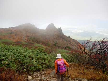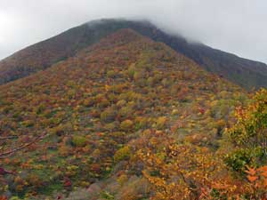 福島県 会津磐梯山(2008年10月12日(日)コース;昭和の森東ゲート(車道歩き)→猪苗代リゾートスキー場→天狗岩→磐梯山山頂→沼ノ平→猪苗代スキー場→青年の家手前車道→(車道歩き)昭和の森東ゲート 標高1,819m, |