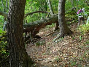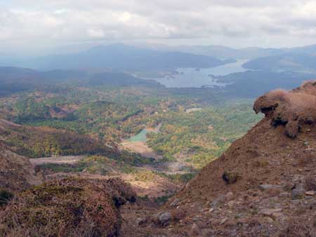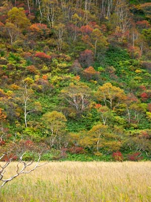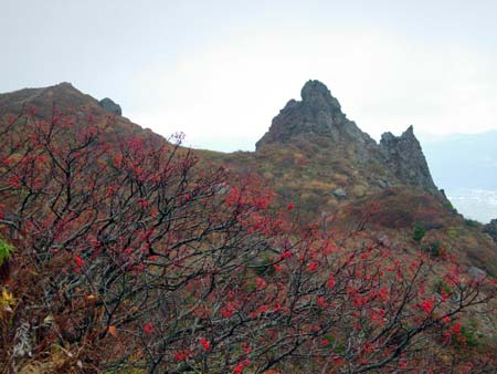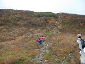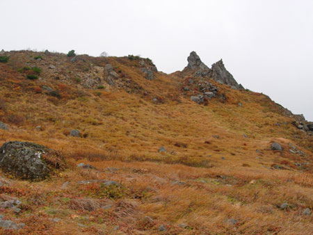 | 10:30 出発。 休憩時間5分。 写真撮って出発です。風が強く寒いです。多くの人が休憩し,食事をしている人もいます。よく我慢できると感心してしまいます。 10:59 標高1,640m 弘法清水到着。休憩。 団体さんが何組も登ってきて,行き交うのに時間がかかりました。「上り優先」と言って下っていかない人がいました。我々が隙間を縫って下りようとしたら「上り優先です。」と2度も声を掛けられました。お互い譲り合いながら進まないと,下り登山者がいつまでも下りられません。「上り優先」は絶対的なものではありませんので,時と場合によって臨機応変に対応すべきと思います。「上り優先」より「団体より個人優先」も必要です。団体側から見ると1人の交差ですが,個人から見る団体人数分を待たなくてはなりません。 11:28 弘法清水出発。 休憩時間29分。 「ガスと風が冷たい!」 下り始めてすぐにタカネナデシコありました。 ここから鞍部までの道程は風景が素晴らしいので,いつ来ても感動します。 猪苗代側の天狗岩です。 ナナカマドの実をバックに天狗岩です。 鞍部に下りると一面の草紅葉が広がっていました。 弘法清水から鞍部に下って,山頂方向(弘法清水)を振り返っています。11:55 標高1,510m 川上登山口分岐通過。 川上登山口,猪苗代・渋谷登山口の道標有り。 檜原湖方向を眺めています。手前に小さく見えているのは銅沼(あかぬま)です。風景写真を何枚も撮っていて時間がどんどん過ぎてしまいました。 ![]() 上の写真は分岐から渋谷登山道方向を見ています。 時間的に10分ロス。 渋谷分岐を過ぎ沼ノ平手前左側にある,小さな沼が紅葉していました。12:26 標高1,400m 沼ノ平到着。 ここでまた写真を撮ります。 草紅葉と背景の紅葉がきれいでした。 さらに進むと赤埴山が見えてきました。こちらの山は紅葉がきれいでした。この付近に赤埴林道への分岐があり,そちらの方に少し入って休憩を取るつもりでしたが,パートナーが以前に登った時にあった,ベンチが無くなっていて休憩せずに戻ってきました。ここの往復と写真撮影で8分程度のロスです。 13:06 1,340m 岩場で休憩。 磐梯山の紅葉がきれいですが,日が当たっていないので光がいまいちです。 磐梯山の紅葉は赤くなく黄色っぽいですね。奥の山にガスがかかっていますが,山頂はさらにその奥にあります。 13:23 1,340m 出発。 休憩時間17分。 13:35 標高1,230m。 天の庭通過。 ここは広場になっていて休憩場所によいです。 ここからは猪苗代が見えます。こちらは猪苗代スキーゲレンデです。14.09 標高935m 青年の家分岐通過。 分岐はゲレンデ作業道路のすぐ上にあります。昔はここでなかったような気がしますが,多分記憶違いと思います。この道以外に,登山道らしいものは他にありませんでした。 「青年の家→」の立て看板がありました。ゲレンデから青年の家への登山道に入りました。 赤松とナラ類の混交林でなかなか良い雰囲気です。斜面のトラバースですが,大変歩きやすい登山道です。 一個所だけ倒木がありましたが,簡単に回り込めます。14:20 標高925m 桂沢分岐通過。 磐梯山,桂沢,青年の家の道標があります。 丁字路になっています。青年の家方向に下ります。ここから沢状になっているところを下ります。 パートナーが先頭でものすごい勢いで下りていきます。付いていくのがやっとです。 14:36 標高735m 車道に出る。 休憩。 ここは大きくカーブしたところにあります。 登山道入り口の小さな看板があります。磐梯山への道標はありません。14:45 出発。 休憩時間9分。 車道に出たらパートナーが「膝が痛い」と言いました。私も左膝に痛みが出てきました。あまり休憩によい雰囲気ではないのですが,車道上に座り込んで休憩しました。 車道歩きで標高710mまで下がりました。この辺は別荘地になっているようですが,あまり別荘は建っていないようです。 別荘地の車道丁字路から登りの車道歩きになりました。私の膝下に痛みがあるので,車道歩きは辛いものがありました。 15:30 標高765m 昭和のゲート(東門ゲート)到着。 途中キノコ採りしながらゆっくり登ってきました。左足に痛みが出ました。持病がまた出ました。 ハナイグチです。カラ松樹下に出ます。菌根性です。味噌汁の具にして美味しくいただきました。 コムラサキシメジに似ていますが,フウセンタケの仲間でしょうか。自信がありません。途中咲いていた高山植物等 ヤマホタルブクロ,ウメバチソウ,ミヤマキンバイ,タカネナデシコ,4種 途中にあったコバギボウシの果実 |