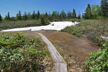 | 14:30 仙台宿舎出発。 ほぼ予定通りの時間に出発することが出来た。仙台宮城インターから高速道に入り,直接会津若松インターまで行く計画を立てていたが,パートナーから郡山の友人に会って,サクランボを渡したいとの希望があったので,郡山インターで降りてサクランボを渡した。 16:50 パートナー友人宅マンションを出発。 郡山市内の正月屋にラーメンを食べに向かった。 17:40頃 正月屋出発。 会津若松市内のサティに寄ったら,6月30日で店じまいする為,食品などもほとんど無かった。それでも翌日の朝食を何とか確保し,行動食も必要なものをそろえることが出来た。 途中で幾つかのコンビニによって,行動食のおにぎりやパンを調達したので,時間がどんどん過ぎていった。 田島道の駅で洗顔,歯磨きの予定だったが,道の駅を見つけることが出来なかった。 檜枝岐スキー場の駐車場は見つけられず。駒ヶ岳登山口駐車場にはトイレ無し,トイレそばには仮眠する駐車スペース無しで悩んでいたら,ミニ尾瀬公園3kmの看板があったので,ミニ尾瀬公園まで行くことにした。以前にミニ尾瀬公園に寄ったことがあり,トイレと大駐車場があることを思い出した。 21:00頃 ミニ尾瀬公園到着。 駐車場には数台の自家用車と1台のキャンピングカーが既に泊まっていました。 携帯のアラームを4:30にセットして就寝。 平成21年6月27日(土) 4:30 携帯アラームで起床。 虫が意外にうるさくなかったので,外に椅子を置いて朝食を食べました。山行中のカップ味噌汁,コーヒー用にお湯を沸かしました。前日に湧かしてポットに詰めてあったことと風が全然無かったのですぐに湧いてくれました。 食事を済ませてミニ尾瀬公園を小豆温泉に向かって出発。 5:45 小豆温泉登山口駐車場到着。 明日が三岩岳の山開きなので,幟をいくつも立ててありました。 6:05 標高800m 小豆温泉登山口駐車場出発 シェルター沿いに駐車場を北に(奥に)進みます。ここからが登山口です。 周辺撮影で4分ロス。 ![]() 登山口から20分ほど進むとショウキランが登山道脇に咲いていました。取りあえず写真撮影しました。暗いのでブレ写真もありました。帰りにまた撮るつもりで出発です。 花撮影で3分ロス。 6:40 標高920m 黒檜沢出合通過。 ここには小さな砂防ダムがありその上を渡っていきます。 ![]() 6:50 標高 m オオルリ出現 沢沿いの登山道にオオルリ♂が出て囀っています。目の前です。♀もいました。 ビデオに撮ってみたがなかなかピントが合いません。デジカメみたいにピンポイントのAFがあるといいなぁと思いました。 7:00 標高1005m 登山口から55分。 休憩。 周辺にはギンリョウソウが群生しています。この辺はブナの群生地で少し開けています。休憩場所に適地です。 7:10 出発。 休憩時間10分。 出発して程なくガクウラジロヨウラク,ギンランありました。キンランを山で見てみたいとパートナーが言っていました。同感です。 7:40 標高1,220m ブナ巨木林通過中。 ここで写真を撮りました。凄く大きいです。 ![]() マイヅルソウ群生です。 登山道の一部開けたところから,これから登る三岩岳山頂が見られました。 ![]() 7:50 標高1,230m 小沢通過。 ここにヤマトユキザサ(オオバユキザサ)がありました。 8:04 標高1,270m 三つ目の沢通過。 ず〜っとトラバース気味に進んできました。やや緊張しながら歩いてきました。危険と言うほどではありません。 この辺に水場に最適な沢があります。少し奥まったところに極々小さな滝状を形成しています。写真を撮るのを忘れました。 8:13 標高1,270m 四つ目の沢通過。 いっぱい沢を通過します。 8:20 標高1,295m。 分岐到着。 休憩。 ここは旧道との分岐です。 ![]() 下のコースタイム距離はパートナー撮影。 8:30 分岐出発。 休憩時間10分。 9:15 標高1,570m 小休止場所で山展望。 「会津駒ヶ岳だろうか。」って,帰宅後カシミールで確認したら全然違っていました。 この辺りから樹木が低くなり日差しがガンガン差してきます。 この辺にイワカガミがありました。白とピンクかかっています。 9:27 標高1,675m 休憩。 ここはやや緩くなっています。 9:39 出発。 休憩時間12分。 「暑い!」 ミツバオウレンありました。群生地です。イワウチワもありました。コミヤマカタバミもありました。 9:50 標高1,720m付近。 カバイロタケ?撮影。 ![]() フウセンタケの仲間かもしれません。もう5年以上キノコから離れているので,ほとんど忘れてしまいました。 少し歩いたところにサンカヨウがあり,写真を撮っていたら,パートナーが水を落としたことに気がつきました。少し戻って探してみましたがありませんでした。先程の休憩場所付近で落としたのかもしれません。 10:03 出発。 休憩時間13分。 10:12 標高1,780m。 ヒロハユキザサありました。 避難小屋手前の木道と雪渓です。パートナーが木道から雪渓に乗るところで,思い切り転びました。おしりが泥だらけになりました。 ![]() 10:25 標高1,820m。 避難小屋到着。 休憩。 小屋の中は2階建てになっています。10人前後泊まれそうで