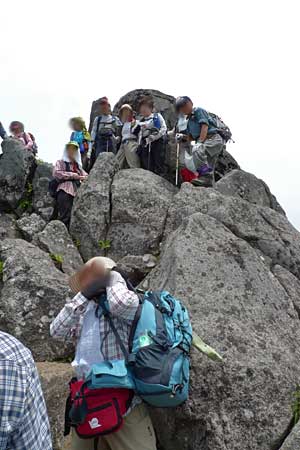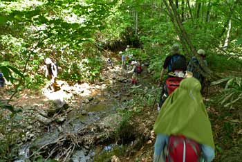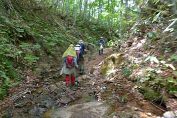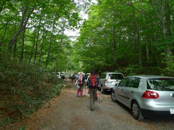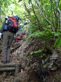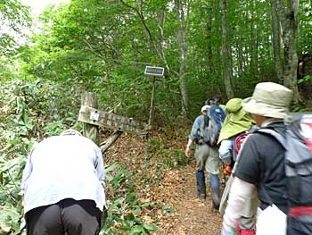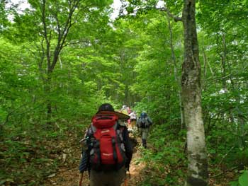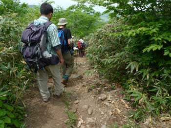 | 仙台峰友会の年一回のバス利用山行に参加した。登山道の幅が広く良く整備されているので,少し長いハイキングの様な道のりだった。日差しがでるとかなり暑くて難儀したが,ブナやナラの巨木林にはいると涼しさを堪能できた。会員の中にはタケノコ採りに精を出す人もいた。猫岩からのダラダラとした下りは変化が無くて,いい加減飽きてうんざりした頃にラビスパ裏磐梯側の登山口に着いた。 会山行の歩きはいつもながらの,短い休憩の長歩きだったので,パートナーの膝を心配したが,なんとか歩き通すことができた様でホッとした。ただ,二日後に痛めていた膝が痛いとのことなので心配だ。 |
