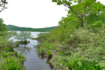| 9:50 標高1,150m 八方台駐車場出発。 駐車場の奥からブナ林を進みます。しばらくは締め固められた砂利道を進みます。 ![]() 駐車場に入りきれない車が道路脇に注射しています。 ![]() ここからいよいよ登山道になります。 ![]() 登山道には落ち葉が引き詰められクッションがありますが,根が張りだしているので,雨降り時には注意が必要と思われます。 駐車場で照り返しが強く,今日の登山は暑さが堪えるかなと思ったのですが,ブナ林に入ったら結構涼しいです。 ![]() 10:03 標高1,195m 花ありました。 ユキザサとサワハコベありました。すぐ先にチゴユリもありました。 10:10 標高1,230m 休憩。 ここは少し開けたところになっています。脱ぎ脱ぎタイムを取りました。 ここはリフト終点になっています。 10:13 出発。 休憩時間3分。 ヤマトユキザサありました。 10:38 標高1,290m付近 道標通過。 山頂まで0.5kmの道標あるところを通過しました。 ![]() 山頂直下にマイヅルソウありました。 山頂直下は段差が50p位ある階段を上っています。ここで皆さんのペースが落ちました。渋滞です。 ![]() 10:53 標高1,404m 猫魔ヶ岳山頂到着。 高度計が1345mを示しています。修正しました。休憩5分取ります。 ![]() 山頂からは磐梯山が雄大に見えます。 ![]() 11:00 山頂出発。 休憩時間7分。 山頂を出発してすぐに三角点がありました。どちらが山頂でしょうか。 ![]() 山頂から段差の大きい階段が続いています。下りの大きい段差は膝にきます。 ![]() 下り途中でこれから向かう雄国沼と雄国山が展望できました。 ![]() 11:19 標高1,335m 猫岩到着。 休憩。 5分間休憩します。 ![]() 11:25 出発。 休憩時間6分。 猫岩の登りと下りが少し急でしたが,それ以外はダラダラと緩斜面を下っていきます。 11:41 標高1,195m 小沢徒渉。 何も問題なく渡れます。 ![]() 沢を渡ってすぐにきれいなブナ林になりました。新緑がきれいです。写真撮りました。 ![]() 「風が無くて暑いですわぁ」 ![]() 11:47 標高1,175m 二つ目の小沢通過。 この沢も苦労なく渡れます。 ![]() 11:55 標高1,155m ブナ林通過中。 新緑のブナ林が凄くきれいで大きなブナ林です。 11:58 標高1,140m 三つ目の小沢通過。 12:09 標高1,105m 道標通過。 雄国小屋まで0.8kmの道標通過しました。ここで雄国沼が初めて見えました。 12:13 標高1,105m ミツバオウレンありました。 沼が左に見えるところにミツバオウレンがありました。 ![]() すぐに四つ目の小沢を通過しました。 12:17 標高1,105m 水門みたいなところ通過。 ![]() 雄国沼の防波堤みたいな所を歩いています。右手にはこれから通過する雄国山が,ぽっこりとした姿を見せています。山頂付近にはレンゲツツジの朱色が見えています。 ![]() 12:25 標高1,110m 雄国沼休憩舎到着。 昼食。 ![]() 小屋には入らないで外の芝生で昼食を取ることにしました。 12時33分に地震があったようです。福島周辺は震度4から3だった様で,かなりの揺れだったそうです。ラビスパ裏磐梯東口で待機してバスの運転手さんは,バスが揺れて大きな地震だったと言っていました。ところが,この休憩中には誰も気がつく人がいませんでした。仙台峰友会27名は全く気がつきませんでした。他に10名以上の登山者がいましたが,誰も騒ぎませんでした。 |