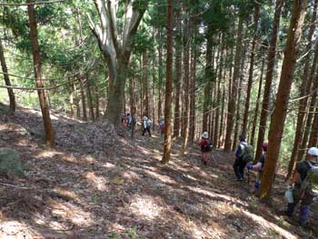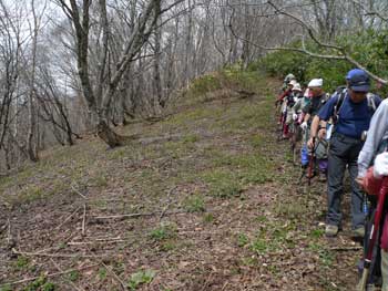 | 13:10 小野岳出発。 休憩時間46分。 車を小野観世音登山口に回送する為,小野岳山頂から会長が一人で大内登山口に戻ることになりました。車を出したOさん,Tさん,Kさんは,会長の車が小野観世音登山口に回ってくるのを待つ為に,早立ちをしました。有り難いことです。 標高1050m付近からエゾキケマンが群生満開です。かなりの迫力です。 ![]() ブナ林の巨木林の中を下りていきます。急下降なので足元に注意を払いつつ巨木を楽しみました。 ![]() 倒壊した巨木がありました。 ![]() 標高950m付近 休憩。 急登途中のやや緩やかになったところで休憩です。 休憩中にイヌドウナ採りました。この辺にもエゾキケマンがありました。 左がイヌドウナです。右はエゾキケマンです。 ![]() 標高950m付近出発。 休憩時間10分。 杉林の急下降のジグザグが延々と続きます。しかし,登山道は杉枝がクッションになり,膝に優しく歩きやすいです。ほとんど滑ることがありませんでした。 ![]() 14:31 標高660m ブナの若い樹林帯。 若い樹林帯で芽吹いているので,きれいです。 ![]() この辺りからトラバース気味に緩斜面を下ります。 14:42 標高570m 石碑通過。 もう緩やかになりました。登山口はもうすぐでしょう。 ![]() 14:48 標高530m 小野観世音登山口到着。 「小野岳登山口」の道標がありました。この付近は広場になっていて,四阿もあり休憩場所になっています。小野観世音神社がありました。広場にはニリンソウが大群落を作っていました。 ![]() この後,舗装道路を200mほど歩くと,東屋が見えてきます。 ![]() 東屋付近は広場になっていて,古い鳥居や神社,ニリンソウの群生が見られました。 ![]() 広場から少し下ると舗装の駐車場になっています。参拝者用の駐車場と思われます。 ここからは雪を被った山が見えました。那須山塊と思われます。 ![]() |