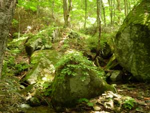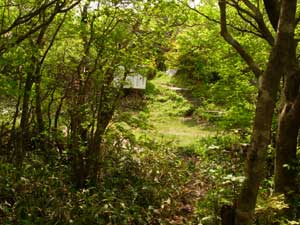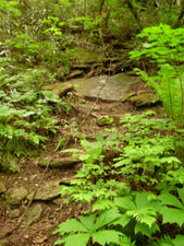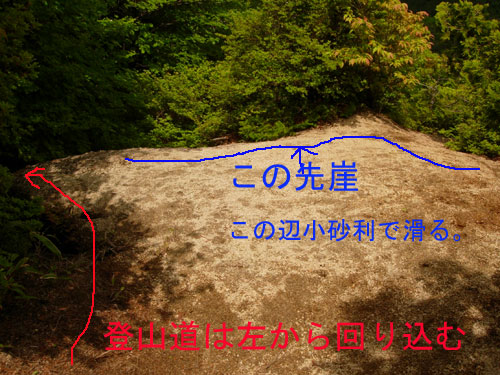 | 8:35 標高790m 大越登山口出発 荒れた車道を山に向かって進んでいきます。先行して福島ナンバー車のご夫婦が登っていきました。ご主人らしき人に「とざんですか」と声を掛けられました。「はい,そうです」と答えました。ちょっと不安そうにしている雰囲気が感じられました。 今日の登山者は我々の他には先行のご夫婦だけのようです。 ![]() 登山口です。手前が駐車スペースです。 しばらくは右にフェンスを見て進みます。 8:46 標高850m 一つ目の小沢通過。 山頂の矢印道標有り。 8:55 標高910m 日山権現・霧島権現分岐通過。 ここは左の道(霧島権現経由)へ進みます。直接山頂へ出る道です。 ここから少し進むと大きめの沢を渡渉します。ここは左斜め前方に登山道がついています。 ![]() @が霧島権現経由で,Aが日山権現経由です。 9:10 標高965m付近 沢づたいに進んでいます。 コルリ,ミソサザイが大きな声で囀っています。ミソサザイは近くで見られました。肉眼でもハッキリ見えました。 ![]() このような沢渡渉がいくつも出てきます。 名前の分からない可憐な白い花がありました。初めて見る花なので写真に撮りましたが,暗いのでブレたりピンボケになりました。帰宅後に調べたら「タニギキョウ」の蕾のようです。 9:25 標高1,010m 一度沢を離れます。 ここまで花撮影,鳥観察で5分ロス。 新緑の良いブナ林です。でも一瞬のブナ林でした。いよいよ沢を離れて尾根に向かうと思いましたが,またすぐに沢に逆戻りでした。 9:30 標高1,050m ロープ,鎖場開始。 ![]() 最初はロープに掴まらなくても登れそうですが,次第に急勾配になってきます。 急登途中で先行ご夫婦に追いつきました。奥さんがかなり疲れているようでした。 9:47 標高1,165m 急登終了 初めのロープ場はそれほどでもなかったのですが,その後,木の根に掴まりながらの急登でした。 平坦地に出ました。周囲は雑木林です。 突然山頂神社前にでます。9:53 標高1,192m 大滝根山神社到着 右階段で登ると神社です。![]() 9:57 標高1,192m 大滝根山山頂出発 神社から右折し,左に自衛隊のフェンスを見ながら進むと,間もなく右折する道があります。 ![]() 10:03 1,180m 高圧線下の広場で休憩。 ここでは以前にも休憩を取りました。大滝根山で唯一開けている場所です。 ヤマツツジが満開です。 10:25 出発。 休憩時間22分。 休憩場所に背丈が5センチ程のマイヅルソウが花を付けています。可愛いです。他にはチゴユリもありました。 出発しようと思ったらパートナーがワラビ採りを始めました。 10:30 標高1,140m 日山権現経由分岐通過。 ここには分岐道標があります。分岐口は狭くて登山道が荒れているように感じましたが,新しい道標がついているので,大丈夫でしょう。 ここには道標が三つも建っていました。 ![]() 10:46 標高1.025m 右に崖に下りる金属ハシゴ有り。「ここを下りてはダメ」 ここはかなり下りにくいので,少し進んでみることにしました。突然のように広場状になっています。 ここは左側沿いに進むと「大越登山口」の道標があります。かなり見つけにくい状態です。先に向かって傾斜がついています。 左側に隠れるように「大越登山口」の道標がありました。11:05 標高905m 霧島権現と日山権現分岐通過 分かりづらいところがありましたが,変化に富んでいて楽しい登山道でした。でも1人だと心細くなったかも知れません。 沢沿いに緩い登山道を下っていたら,ギンランがありました。ちょっと嬉しくて写真に撮りました。 11:30 標高780m 登山口到着。 下りてきたら駐車場にいわきナンバー2台と水戸ナンバー1台の車が増えていました。 途中咲いていた花 タニギキョウ,ギンラン,マイヅルソウ,チゴユリ |