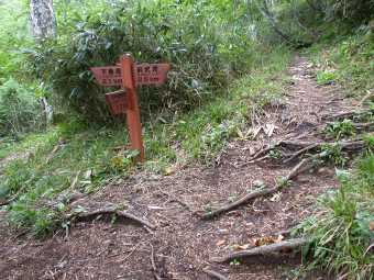 歩き始めてすぐの登山道風景。 左に行くと不動岳。体力等に自信のない人は行かない方がよいようだ。 |