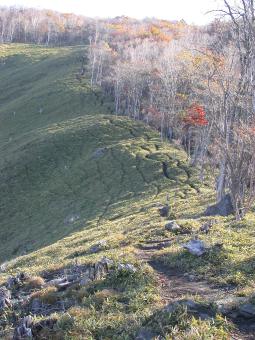 後袈裟丸山との鞍部の八反張は風化による崩壊が激しいので,通行禁止とする立て札があった。ただ,次週に後袈裟丸山に登ったときに,八反張を通過してきた登山者がいて,確認してみたらロープが張ってあって,特に危険もなかったとのこと。 |