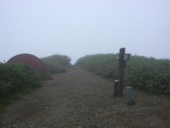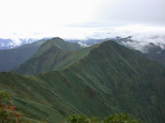 10:27 標高1,880m ノゾキ通過。 オキの耳からノゾキまでの下りは,岩が滑って滑って難儀した。ほんとに滑る。 思いの外時間がかかった。 ここから白毛門方向はガスで全く見えないが,オジカ沢の頭の尾根周辺がきれいに見えている。笹の黄緑と濃い緑のコントラストが印象的だ。 11:00 標高1,960m 一の倉岳到着。休憩。 ここは山頂の道標があるが,三角点はここから100m〜200m先であろう。以降と思ったが面倒になってやめた。 ここには避難小屋があるが,かまぼこ型の鉄板製の避難小屋だった。かまぼこ型テントを鉄製で作ったような物だ。緊急に利用する以外はとても泊まれない。私には。でも,テントを担げないからやっぱり泊まるのかな。 ここで少しゆっくりして行動食を食べた。 休憩中に外国人男女が通過。話しかけたが日本語が通じない。縦走してどこかに下りるようなジェスチャーだった。荷物はすごく軽そうだった。 他に男性3人組が通過。今日一日で清水小屋まで行きそこで小屋泊まりし,次の日,白髪門へ回って降りるとのこと。後で地形図を見てびっくり。すごい距離だよ〜ん。