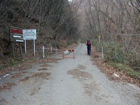 9:25 標高450m 約10分弱歩くと「三方境入り口」の道標があり,そこを中木沢へ崖を降り,川を渡って杉林に入っていく。少し大きい川なので増水時には川を渡れなくなるだろう。 杉林内は道は付いているが雪が降るとはっきりしなくなると思う。
