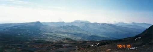 松田岳付近からトムラウシ(正面)と十勝岳(右)を遠望。