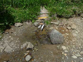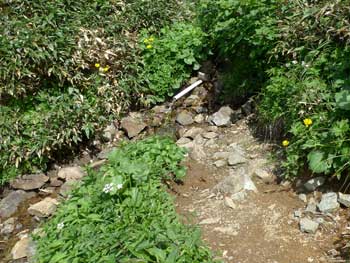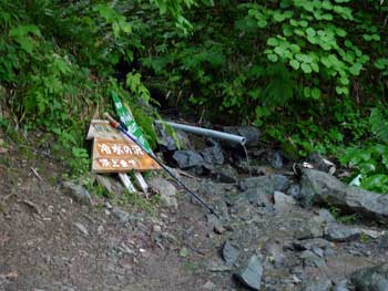 「冷水の水場」,「憩沢の水場」,「蛇紋岩崩壊地と湿原お花畑の間に2箇所」の合計4箇所がある。 冷水の水場と蛇紋岩崩壊地を過ぎ湿原手前2箇所の内「上の水場」は冷たくて美味しい。どちらにも三角看板設置有り。 下記左写真「冷水の水場」 中写真は「湿原手前最初の水場」右写真は「湿原手前二番目の水場」 |