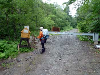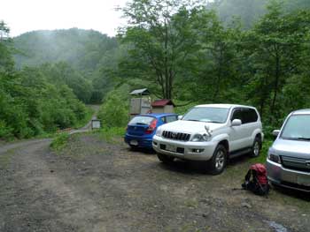 @国道452号線を北上し,シューパロ湖を右に見て進み,最初の橋(白銀橋)を右に進む。ここに夕張岳への道標があるので安心できる。 A所々に設置されている道標に導かれ,ペンケモウパロ川に沿う林道をひたすら走る。途中まで舗装道路だがすぐに砂利道になるが,良く整備されていて乗用車でも十分走行可能。 B白銀橋からしばらく走行すると一つ目のゲート(夕張岳夏季登山期のみ開放)がある。このゲートから先は大型バス通行禁止の看板あり。 C一つ目のゲートから4.5kmほどで左股沢橋に到着する。 D左股沢橋から200mで車両通行止めとなり,入林ポストが設置されている。ここが登山口である。 |