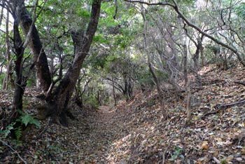 常緑樹の緩やかな登山道を歩いています。日は木漏れ日となって差していますが,身体は冷えています。風がないのが幸いです。
