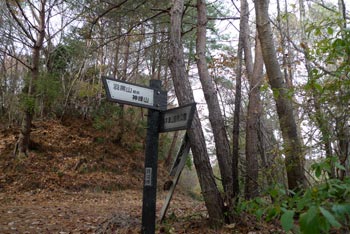 林道に出ました。ここには道標がありました。羽黒山には林道を左に進むようになっています。