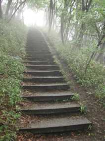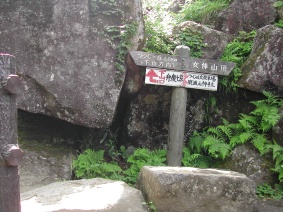 標高805m付近。男体山探勝路分岐通過。コンクリートの舗装探勝路になっています。 ここで,看板と右に行く階段の写真を撮りました。 階段登り切ったところに四阿があります。帰りは梅林ルートの登山道標はないのでこの四阿が目印です。 8:41 標高835m。