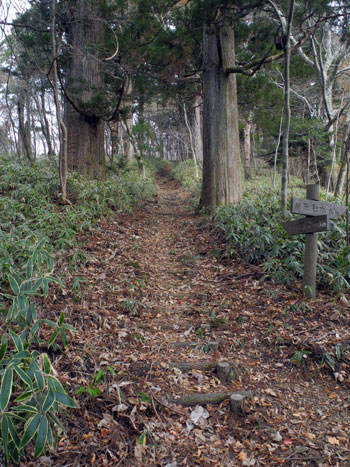急坂が始まってすぐに,門構えを連想させるようなスギの巨木が両側に立っています。