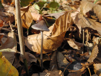 落ち葉の中から小さな黒褐色のきのこが出ていました。名前は分かりません。