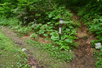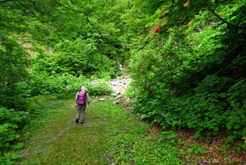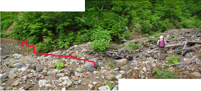 | 23:45頃 夏油温泉に到着。 心配していたトイレがすぐに見つかりトイレをすませ,「元湯夏油温泉」の駐車場で車中泊。 00:00 携帯を朝4時30分にセットして就寝。 車にセットしている棚の下の段が狭くて,寝ているとき窮屈だった。以前から気になっているのだが,解決策を検討中だ。寝ているときに変に力を入れたら,腰を痛めたようだ。 6月13日(土) 4:20 起床。 4:30にアラームをセットしていたが,4:10には目が覚め4:20に起床しました。 車内に目隠しをしていなかったので,外の明るさで目が覚めたようです。 旅館前の駐車場からトイレ前の駐車場に移動し,トイレをすませていたら,5時頃には車が1台到着し,小さなザック一つ背負って出発した女性がいました。「牛形山に行ったのか,山菜採りか」と話していたが,なんと,お坪の庭を少し越えた当りで下山してくるところに出会いました。パートナーが聞いた話では金明水小屋まで行って来たらしい。その異常な早さにただただ驚くばかりです。食事をし,山行用のお湯を沸かして出発準備をしていると,男性単独者が6時頃出発していきました。この登山者とは山頂手前ですれ違いました。 6:20 標高580m 夏油温泉登山口出発 ![]() 登山口から「元湯夏油温泉」を左に見て,鬱蒼とした「一部丸太階段がある登山道を上ります。とっても雰囲気がよいです。 ![]() 少し上ると元湯夏油温泉からの登山道と合流しました。 「ガイド本等によると温泉の裏側から上るようになっているが,登山道を付け替えたのだろうか。」 6:30 標高615m 最初の林道。 分岐に経塚山6.9kmの道標有り。 いよいよ長い林道歩きかと思っていたら,少し歩いた先で行き止まり,「天狗の岩」の案内板があり,その手前から右に山道歩きになりました。 少し上ると右からの合流道で,あとから上ってきていた人と会いました。この辺一体の管理人さんで近道をしてきたようです。帰りにこの道を降りようとしたら,藪こぎ状態に見えたのでやめました。 6:42 標高690m 2度目の林道。 経塚山6.5km,夏油温泉0.5km, 牛形山3.6kmの道標有り。 ![]() いよいよ長い林道歩きです。 林道周辺にはフキがたくさんあります。帰りが楽しみです。 林道終点まで山菜を探しながらのんびり歩いてきた。アイコ,ミズ,フキがたくさんありました。また,ノビネチドリもありました。写真に撮りました。 花撮影などで5分ほどロス。 7:28 標高700m 沢到着。 休憩。 いきなり大きな沢に出ました。 ![]() サイトなどでは林道終点は広場になっていて,そこからかなりの急下降で沢に出ると書いてあります。でも,ここは広場にはなっていませんし,急下降にもなっていません。 また,別なサイトでは林道が崩壊しているとも書いてあったので,どうやらここがその崩壊場所らしいですが,規模がかなり大きく道路が崩壊した程度ではありません。 「どっから渡ったらいいのか分からん」 沢の向こうを見たら林道が続いているようなので,大規模土石流が発生して沢が出来てしまったのでしょうか。 7:41 標高700m。 沢徒渉開始。出発。 休憩時間13分。 ここは下図のように沢を渡った。さすがにストックを出して渡る必要があった。緊張した。 ![]() 沢を渡り切ったら「経塚山登山道」経塚山4km ,夏油温泉3kmの道標有り。 沢から少し歩いたら林道終点で狭いけど広場になっていました。ここから急下降です。ここにも道標がありました。沢への降り口が分かりにくいだけにありがたい道標です。 ![]() |