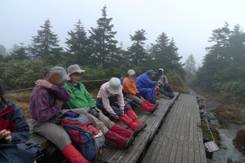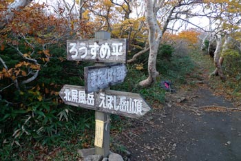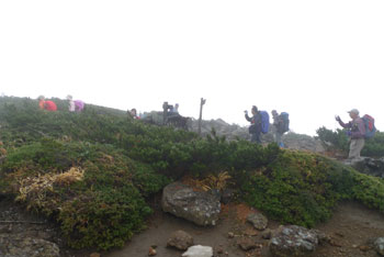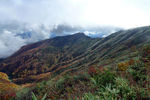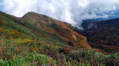 | 7:38 標高1,515m 刈田峠登山口駐車場出発 会長の車の駐車スペースがないので,登山口からかなり先まで行ったようです。Oさんの車で来た我々3人は準備をして登山口で待っています。 風がビュービューと吹き抜けていきます。雨具の上を着込みましたが,かなりの寒さです。樹林帯に入り込めば風を防げることを期待しています。 駐車場で登山支度をしていたら,隣の車の単独登山者が「どこまで行くのか」などと話しかけてきました。質問に答えていたら,その単独登山者は駐車場からいっこうに出発しません。 登山口で会長達を待っていると,その登山者も我々の側から離れようとしません。 会長達が登山口について,「さあ行こうか」と声を掛け合ったら,その単独登山者も「さあ行こう」みたいなことを言って,我々9人の列の5番目について歩き始めました。「なんだぁ,こいつ」と思ったのですが,そのまま無視していました。後で会長達から,O車グループの誰かの知り合いかと思った。そうです。 この単独登山者は結局南屏風岳まで付いてきました。我々がその先に進もうとしたら,ついに「ここで失礼します」と言って引き返していきました。出発時には何の挨拶もなく勝手についてきたのです。不思議な人でした。 8:13 標高1,684m。 前山通過。 ![]() 8:32 標高1,745m 杉が峰到着。休憩 8:40 杉が峰出発。 休憩時間8分 相変わらず風とガス。 8:55 標高1,670m付近 芝草平入口到着。 休憩。 ここには休憩用のしっかりとしたベンチがあります。Oさんから「時間調整とガス晴れ待ちで20分休憩」と言われました。相変わらずのガスですが風は当たらなくて良い場所です。 ![]() チングルマの葉は茶色に変色していました。もう少し鮮やかな赤なら奇麗です。 ![]() 9:10 芝草平入口出発。 休憩時間15分。 20分休憩の予定が15分で出発です。峰友会の皆さんはせっかちなのか,のんびりと休憩を取れない人達ばかりです。(笑) 9:45 標高1,825m 屏風岳到着。 休憩。 ここで昼食の予定ですが,時間が早すぎます。風も当たります。芝草平まで戻るか,南屏風岳まで行くかなど,いろいろ話し合った結果,南屏風岳まで行くことになりました。 この場所で会長から「会長とOさんは車を取りに刈田峠に戻るが,他のメンバーは後烏帽子岳鞍部に下りて,澄川林道登山口に向かうよう」言われました。地形図も持ってきていないし,初めてのコースなので,かなりビックリしましたが,Sさんが地形図を持ってきていました。 8:55 出発。 休憩時間10分。 南屏風岳に向かい出発。出発時間確認しませんでしたが10分程度だと思います。 10:27 標高1,810m 南屏風岳到着。 休憩。 風がビュービュー吹いています。ガスも相変わらずかかっています。 ![]() 風を避けて全員が座って,なおかつ芋煮鍋をやる条件の場所はありませんでした。 Nさんが不忘山方向にさらに進んで,場所探しをしてきました。どうやら風を避けられる場所があったようです。 10:45 南屏風岳出発。 休憩18分。 風を避けて不忘山方向に出発。 10:50 標高1,750m付近 登山道脇ザレ場で休憩。 登山道脇に少し傾斜がついていますが,なんとか座れて芋煮ができるザレ場がありました。 昼食開始です。芋煮ができるまでいろいろなものが出てきました。Nさんがハエトリシメジと会長の誕生日祝いのケーキを持ってきました。どちらも美味しく頂きました。 食事中に風向きが変わって,風が当たるようになってきましたが,寒さはそれほど堪えませんでした。 12:00 標高1,750m付近出発 休憩時間1時間10分。 昼食タイムを十分に楽しんでいざ出発です。 南屏風岳から屏風岳にいたる尾根上から水引入道と不忘山が奇麗に見えました。 水引入道です。この辺りだけ紅葉がきれいでした。 ![]() 不忘山への稜線です。中央一番高いところが不忘山です。 ![]() 12:55 標高1,817m 屏風岳到着。 途中の水引入道と後烏帽子岳の紅葉がきれいでした。 ここまで風景撮影で10分ロス。 13:14 標高1,735m 倉石秋山沢コース分岐到着。 休憩。 ここでいよいよ会長とOさんと別行動です。 13:18 倉石秋山沢コース分岐出発。 休憩時間4分。 ミノさんがトップで,KWさん,私,パートナー,Sさん,SKさん,Nさんの順で歩き始めましたが,ミノさんが異常に速く歩いていきます。手綱を解き放たれた馬のようなスピードです。皆さんから「速すぎ〜」と声がかかるのですが,まるで聞こえないみたいに,一人だけどんどん進んで行きます。パートナーから「Dさん,前に行って」と声がかかりました。SさんやSKさんからも同様の声がかかりました。私は「でも,KWさんの前に出ていいのかなぁ」と言ったら,KWさんから「かまわないです。前に出て下さい」と言われ,私が2番手になりました。ミノさんは一人で先に進んでしまいますが,他のメンバーはゆっくりと歩いていきました。 緩い上り坂を10分弱進むと,会長から言われていた,急下降に取り付きました。 なるほどかなりの急下降で,ロープの連続です。 ![]() 14:11 標高1,510m ろうずめ平到着。 休憩 急下降が緩やかになり,少し歩いたら広場状の丁字路に,突