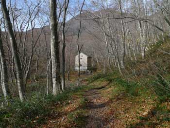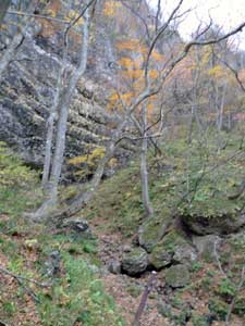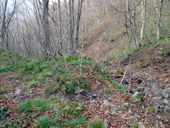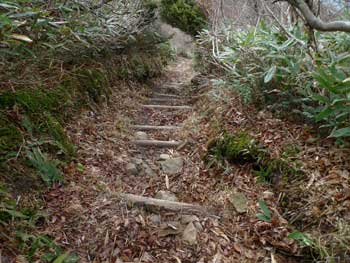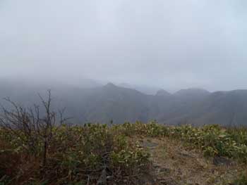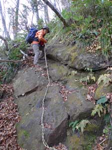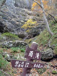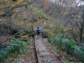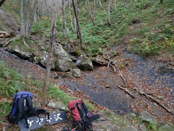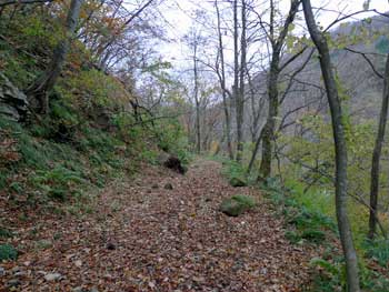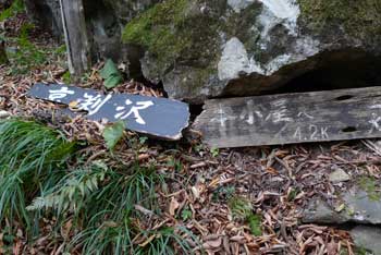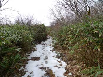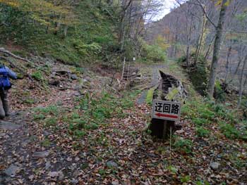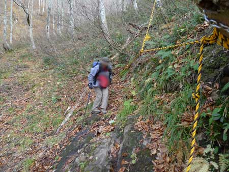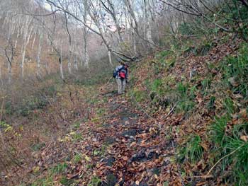 | 11:05 大東岳出発。 休憩時間05分。 すぐに出発するつもりでしたが,キノコ採りの人と話をして少し遅くなりました。 山頂から少しの間は雪がありました。 ![]() 「弥吉ころばし」の急下降始まりまでは,緩やかに下りますが,ズブズブドロドロの登山道でした。 11:15 標高1,320m付近 段差の大きい階段有り。 足が合わなくて辛いです。段差が大きいです。 ![]() 11:18 標高1,305m 丸太階段終了。 15mほどの下降でした。やれやれです。ここから緩く登り返します。 風がビュービューと強いです。空を見上げると雲の流れが速いです。 周りの山にもガスがかかっています。早く下りのヤブに入りたいです。 ![]() 12:00 標高1,150m 一度緩斜面になりました。 「弥吉ころばし」の急下降は,周りの樹木が刈り払いされていて,手がかりが無く苦労しました。おまけに石はほとんど浮き石状態なので,かなり慎重に下りました。 5年前には樹木が登山道を覆うようになっていたので,それらを手がかりに下りていたので楽でした。 12:10 標高1,045m 尾根の台地状で休憩。 山頂から1時間程急下降を下りてきました。ここからまだ少し急下降が続きます。 12:21 出発。 休憩時間11分。 ここからジグザグの崖下りでした。急下降です。 何カ所かの鎖場のへつりを通過しながら下りていきます。 ![]() ![]() 12:43 標高890m 沢出合。 やっと沢に出ました。ここから緩やかに下降します。やれやれです。 ![]() 冷たい風が吹き下ろしてきます。ウインドブレーカーを着込みます。休憩時間2分。 13:07 標高715m。 樋の沢避難小屋到着。 休憩。 小屋が見えた時には「やれやれ着いたか」と思いました。 ![]() 遅めの昼食にします。 13:48 標高720m。 避難小屋出発。 休憩時間40分。 小東峠1.8km,本小屋6.0kmの朽ちた道標が地面にありました。 これから長い長い下りが始まります。 途中何カ所かの鎖馬がありました。登山道を緩やかに進んでは,急下降の繰り返しが続きました。 ![]() 14:48 標高620m。 けやき沢到着。 小休憩。 水を飲むための小休憩を取りました。 ![]() 14:52 けやき沢出発。 休憩時間4分。 樋の沢避難小屋を出発して,ちょうど1時間過ぎましたが,あまり疲れが感じなかったので,小休憩で先に進むことにしました。 15:06 標高595m。 京淵沢通過。 ![]() 15:13 標高565m 裏磐司到着。 ここには石のベンチが2基設置されています。コーヒーを飲みました。 ![]() 15:32 標高575m 裏磐司出発。 休憩時間19分。 かなりのんびりと過ごしてしまいました。二口登山口に着く頃には暗くなりそうです。「少し急がなくちゃ」 15:47 標高515m 雨滝通過。 樋の沢3.3km本小屋2.7kmの道標有り。 ![]() 16:00 標高430m 白滝の沢通過。 この沢の徒渉はこの道標の30mほど下に徒渉点があります。 ![]() 黄葉がきれいでしたが,ほとんど葉を落としていました。白滝の沢を過ぎると林道歩きになりました。 ![]() また沢がありました。ここには木道がかかっていましたが,朽ちて崩れていました。 迂回路の看板をみたので,また山に登るのかと思いましたが,木道の脇から沢に下りて沢を渡ったあと,アルミの梯子を登って向こう側の道路に出ます。 ![]() 16:32 標高350m 最後の沢通過。 最後の沢です。ここは木橋がかかっていますが,近いうちに朽ちて落ちそうな雰囲気があります。 ![]() 16:35 標高350m 登山口到着。 「いやぁ,暗くなりました。懐中電灯はいらないけど」 |