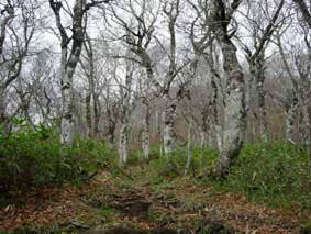 | 10:09 標高1,095m。 7合目通過。 この辺は平らです。7合目の頭は小ピークです。 この辺の樹木はダケカンバで,もうすっかり葉を落としています。 ここから20mくらい進むと,こぶし平の標識があります。 本小屋4.3km,大東岳1.1kmの道標有り。 ここはこぶしと言うより,ブナ林で雰囲気がよいです。 こぶし平の標識は朽ちて地面に落ちています。 ここで休憩です。 ![]() こぶし平周辺のダケカンバ林です。雰囲気が良いところです。 |