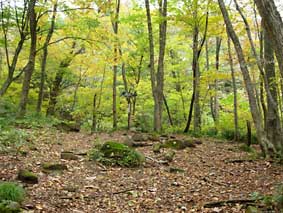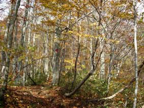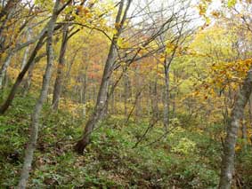 ![]() 立石沢です。行きと帰りでは風景が一変します。沢を渡りきったら,振り返って帰りの渡渉地点を,覚えておきましょう。 ![]() 立石沢広場です。道標があります。 ここは休憩によい場所です。歩き始めて50分位なので休憩の気持ちにならないのですが,ここで軽く休憩をとった方がよいと思う場所です。 ![]() ブナ林の黄色い紅葉です。 ![]() 船型連峰展望所の道標です。 ![]() ![]() 1,019mピークから大東岳の展望です。 |