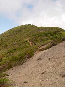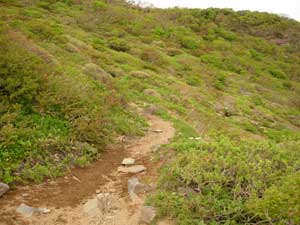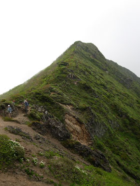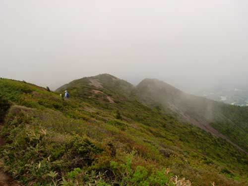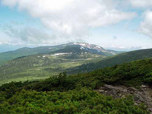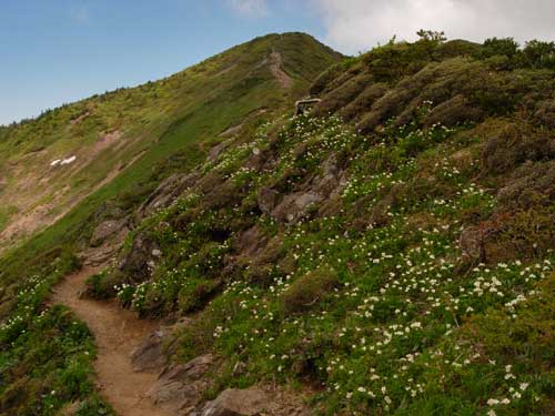 10:30 標高1,750m 鞍部通過。![]() 鞍部付近はハクサンイチゲの大群生とユキワリコザクラの咲き競りが素晴らしいです。 ガスがすっかり晴れました。写真撮りました。 鞍部を通過するとなだらかな稜線歩きです。10:40 出発。 標高1,810m 南屏風岳到着 通過。 熊野岳がものすごくきれいに見えます。残雪がきれいです。 ![]() 最後方に見えているのが,蔵王連峰の熊野岳です。 ここは通過して屏風岳方向に歩いてみます。場合によってはジャンボリーコースを下りることも頭にありましたが,持病の膝にピリっと痛みが走りました。やっぱり戻ることにします。 不忘山から南屏風岳間は花撮影で5分ロス 10:48 標高1,810m 南屏風岳到着。 休憩。 不忘山1.5km,屏風岳1.5kmの道標有り。 この山頂にはミネズオウが満開です。何の花か分からず取りあえず写真に撮りました。帰宅後に図鑑で調べたらミネズオウでした。昨年の6月に安達太良山で撮影しているのですが,まったく記憶にありませんでした。 南屏風岳で食事をしていたら,雲の上に飯豊連峰が顔を出してくれました。 ![]() ほぼ等倍でトリミングしているので,画像が荒くなってしまいました。 11:10 南屏風岳出発 休憩時間22分。 ![]() 南屏風岳出発後間もなくの場所から不忘山の展望です。一番右奥が不忘山です。 南屏風岳と不忘山の鞍部で芝草平から来た人に聞いたら,芝草平のチングルマまったく早く,何も咲いていないそうです。 不忘山への登りが急登に見えます。でも歩いてみるとそうでもないです。11:56 不忘山通過。 山頂付近から不忘の碑と硯石方向展望です。![]() 少し下りてから振り返ると南屏風岳から水引入道が展望できました。 12:12 標高1,640m。 不忘の碑到着 休憩。 12:23 出発 休憩時間11分。 不忘の碑分岐からの下山道です。12:58 弘法清水通過。 13:17 標高1,210m 涸れ沢通過。 大分足が疲れてきました。南屏風岳からズーッと膝に痛みがあります。膝がほんと心配です。 13:25 標高1,170m 道標到着。 休憩。 ![]() ブヨが多く顔付近にまとわりついてきます。虫除けパッチを何枚も貼ってみましたが,あまり効果がありません。値段が高くて効果が少ないので,やはり虫除けスプレーが良いです。 13:37 出発 休憩時間12分。 みんなに追い越されています。太ももは疲れていないのですが,膝に痛みがありスピードを上げられません。悔しいです。「膝が悪くなっているなぁ。」 13:55 標高1,005m 白石高校山小屋跡地通過。 ここまで下りてくるとセミが鳴いています。うるさいくらいです。 14:10 標高895m 無料休憩所通過。 ここは右に進みます。14:15 標高870m 駐車場到着。 「疲れていないんだけど足(足指の周辺)と膝が痛いなぁ。」 良い天気でした。登っている時南屏風に若干ガスがかかっていたけど最高の天気でした。風もなかったのでフリースも必要なかったです。 途中咲いていた植物 ミヤマアヅマギク,アヅマシャクナゲ,イワカガミ,オオカメノキ,ガクウラジロヨウラク,シラネアオイ,チゴユリ,チングルマ,ツマトリソウ,ハクサンイチゲ,ハクサンチドリ,ホソバイワベンケイ,フデリンドウ,ミツバオウレン,ミツバツチグリ,ミネズオウ,ミヤマオダマキ蕾,ミヤマキンバイ,ユキワリコザクラ (18種類) 種数は少なかったけどハクサンイチゲ大群生とユキワリコザクラ初めて見られたのが良かった。他にはイチゴ,ツツジ2種等。 |