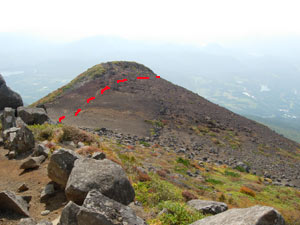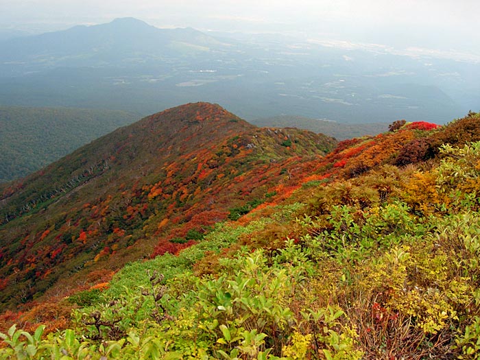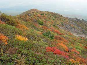| 12:04 標高1,705m 不忘山到着。 休憩。 「いやぁ,けっこうガスと風が強かった。」 不忘山山頂手前から不忘の碑への尾根は紅葉で真っ赤でした。12:23 不忘山出発。 休憩時間19分。 山頂から不忘の碑方向です。12:34 標高1,620m 不忘の碑通過。 「風もガスもない。これは硯石から登っても良かったな。」 不忘の碑から硯石登山ルート方向を見ています。赤点線がルートです。このピーク先は大ガレ場です。12:48 標高1,500m付近。 風が収まってきて,暑くなってきたのでフリースを脱ぎました。 13:04 1,340m 弘法清水通過。 ここには白石女子校の団体がいました。人が多すぎて休めません。 13:29 1,155m 道標のあるところ通過。 ここには男子高校の団体がいました。60人位の人数が登山道脇に座り込んでいます。ほとんどの人から「こんにちは」と声を掛けられるので,応対がついいい加減になります。 休むタイミング取れずに歩いています。 13:46 960m 白石女子校山小屋跡地通過。 山小屋跡地少し手前で写真を撮りました。この辺はまだ全然紅葉していません。山小屋跡からスキー場に向かう登山道両側は,ススキでいっぱいです。登りにはただただ急ぎ足で,周りが見えていませんでした。 ![]() エゾオヤマリンドウがありました。完全に開花していました。初めて全開したものを見ました。 ![]() 写真撮影で2分ロス。 14:02 標高885m。 無料休憩所到着。トイレ休憩。 とうとう休憩を取らないで不忘山から降りてきました。最後に花撮影で2分ほどロスしただけでした。 14.05 出発。 トイレ休憩3分。 14:10 標高855m 駐車場到着。 途中で登山靴を洗ってきたので,少しよけいに時間がかかっています。 いやぁ。調子よかったなぁ。がんばれました。朝ちょっと足の調子が悪そうな感じがしていたのと,弘法清水より手前の登山道で,あまりに段差が強いので,少し引き返そうとした時,小砂利に足を滑らせ,脛付近の筋肉に痛みが走りました。が,階調に歩き通すことができて良かったです。「自信になった」 山頂付近にタカネバラの果実がありました。何の果実かまったく分かりませんでしたが,帰宅後に花季に撮った写真の葉から,タカネバラの果実であることが分かりました。 ![]() 途中咲いていた高山植物等 イブキジャコウソウ,ウメバチソウ,エゾオヤマリンドウ,トリカブト,ミヤマアキノキリンソウ,ヤマハハコ,6種 |