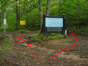 登山口;登山口に設置された大きな看板の右側を登る。左側を進むとキャンプ場内に進んで,登山道につながっていない。 |