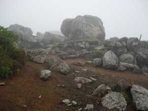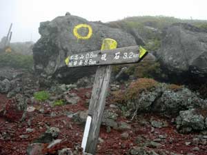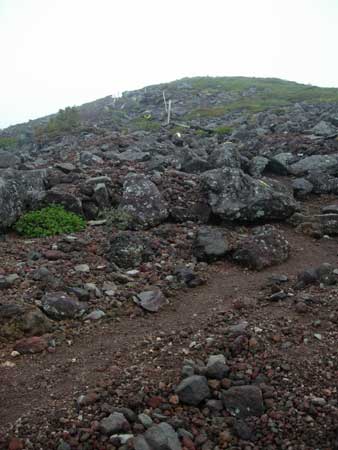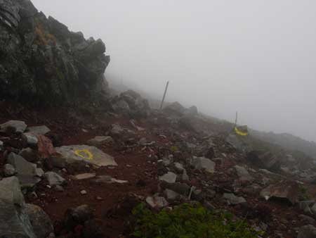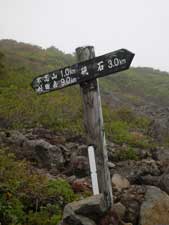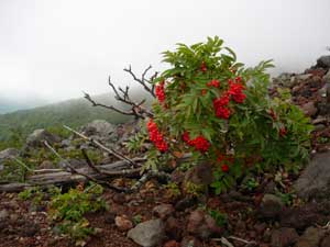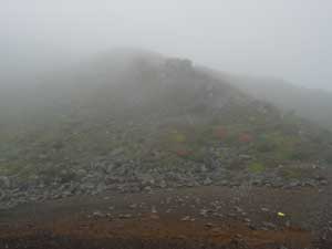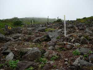 | 9:30 標高1,430m 大きなガレ場到着。 ここには道標があります。トリカブトがありましたが,場所がちょっと離れているので写真が撮れません。ここに道標がありましたが,朽ちていて文字が読めません。 ナナカマドでしょうか。ガレ場の中に1本だけありました。9:40 標高1,460m 大ガレ場到着,通過完了。 ここは2番目の大ガレ場です。 「おぉ,風が強い。防寒着着ないとダメだな。これは。」 ここには不忘山1km,苅田岳9km,硯石3kmの道標有り。 ![]() 「あと,10分ほど進んで防寒着を着よう。」 大ガレ広場から下を振り返ったら,ガレ場の斜面が右の方に引き込まれるような形状になっています。左の方に誘導するように,黄色ペンキでマーキングしてありますが,ガスって来たらかなり危険です。「帰りは気をつけよう。ガスって来たら危険だ。ここは」 さらに大ガレ場が続いています。 ![]() 9:50 標高1,540m 休憩。 1時間歩いたので休憩です。 不忘山1.8km,硯石3.2km,苅田岳8.8kmの道標有り。 ![]() 道標の下で休憩を取りました。 かなり風が強く,ガスも濃くなってきました。 休憩場所で風を避けたいのですが,避けるような場所もありません。 とりあえずフリースを着たので,寒さはしのげます。 不忘山山頂までは行けないかもしれません。不忘の碑までは何とか行きたいと思っています。 10:00 標高1,535m 出発。休憩時間10分。 10分間たちました。 「登ります!」 腕時計の高度計が10分間で5m標高を下げたので,天候が下り坂かもしれません。 ガスかかってきたので,一度は撤退を考えましたが,もう少し登ってみます。 少し進むと不忘の碑が見えてきました。不忘山山頂はガスの中です。 ![]() 10:09 標高1,600m 不忘の碑到着。 撤退。 道標のあるガレ場から不忘の碑まで9分で着きました。 ![]() ここまで来てみましたが,山頂方向は完全にガスの中です。ここから15分程度で山頂に着くと思いますが,下りの大ガレ場のガスも気になるので撤退です。 下りのオオガレ場にもガスがかなり立ちこめてきました。下ってくる時に大ガレ場にイブキジャコウソウがまだ咲いていました。「なんか得したような気がします。」 10:45 標高1,285m付近。 細かい雨。 雲なのか霧なのか,細かい雨が降り出してきました。 「霧ではないなぁ。何とか樹林帯に入りたいな。雨具を着ないですむように。」 10:56 標高1,155m 休憩。 ここは登りで1時間たって休憩した同じ場所です。いつの間にか雨もやんだようです。 それにしてもここの雰囲気は素晴らしいです。来年には是非また期待雰囲気を持っています。 11:05 出発。 休憩時間9分。 ここで菓子パンを食べました。 ブナとナラの樹林帯を歩いています。ほんとに癒されるような雰囲気があります。 ![]() 11:49 標高705m 登山口到着。 登り初めに腕時計の高度計を,標高715mにセットしていたので,やはり天気がやや下り坂のようです。不忘の碑で戻ってきたのが,正解だったと納得させています。 途中咲いていた高山植物等 イブキジャコウソウ,ウメバチソウ,エゾオヤマリンドウ,トリカブト,ミヤマアキノキリンソウ,ヤマハハコ 6種 |
