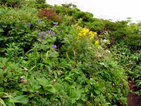 10:50 標高1,530m付近。 ガレ場の広場通過 不忘の碑や硯石の山頂が見えます。 11:00 標高1,530m付近。 2番目のガレ場の広場 お花畑です。「すげーっ」 何枚も写真に撮りました。ウスユキソウが群生しています。 ウスユキソウ,ウメバチソウ,オクトリカブト,ハクサンシャジンが群生しています。 11:10 標高1,620m 不忘の碑到着。 硯石3.7km,苅田岳8.3km,不忘山0.3kmの道標あり。 ここは通過するつもりが,イブキジャコウソウがあり,写真撮影にまたまた時間をとってしまいました。 11:17 不忘の碑出発。 休憩時間7分。 不忘に碑から不忘山が超花畑。「というか登山道の周りが花だらけだ。写真撮影で前に進めない。」 イブキジャコウソウもありました。群生しています。 |