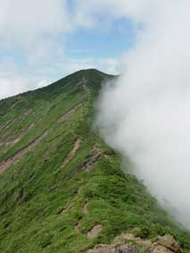 11:50 標高1,705m。 不忘山到着。 休憩 山頂は広くてかなりの人数が休憩できます。 ハナイカリもありました。 12:10 南屏風岳に向かって出発。 休憩時間20分。 写真を撮ってすぐに出発するつもりでしたが,少し食事をしてから出発することにしました。 不忘山の先のピーク急下降から南屏風岳への展望も,稜線にガスがかかり良い風景です。 毎週来ている人の話だと,今年はトリカブトがすごく良いらしい。水引入道の方に行くと白いトリカブトがあるらしい。来年は行ってみたいなぁ。 この辺はハクサンイチゲの群落地でした。イブキトラノオもいっぱいありました。 13:03 標高1,810m 南屏風岳到着。 休憩。 屏風岳1.5km,不忘山1.5km,苅田岳6.5km,硯石5.5kmの道標あり。 ここでカップシチューを飲みました。和昭はキノコシチューを飲んでみたら美味しいです。歯ごたえがあり良かったかも。 ここからは杉が峰,熊野岳が見えます。でも,目の前の屏風岳,ずっと先の苅田岳はガスの中でした。 刈田岳と屏風岳はガスの中でした。 |