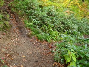 | 7:40 大滝キャンプ場駐車場到着。 県道147号線から小荒沢林道を進んだが,かなり荒れていた。しかし,南本内岳への林道に比べるとかなり楽な走りだった。女峰山への志津峠から林道終点までに比べたら,はるかにましな道路でした。 7:55 標高1,040m 大滝キャンプ場登山口出発 この登山口が国土地理院の地形図上どの位置になるのか全く見当が付きません。 下ってきてから確認することにします。 蛇ヶ岳経由で下ってきてから,理解することができましたが,大滝キャンプ場はかなり標高の高い位置にありました。 少し歩くと紅葉している木がありました。モミジの赤が際だちます。でも周辺は紅葉にはまだ早い様相で,雇用が楽しめるか心配です。 ![]() 8:02 標高1,080m 湯谷地の道標有り。 地形図上の分岐にはまだかなりあると思われるので,分岐はまだ先だろうか。 {実はここより手前(歩き始めて3分位)で三光の宮分岐の道標がありました。ここが分岐だったことが下山時に分かりました。} 周辺は紅葉が始まってきていて赤が綺麗です。ブナも色づき始めています。 8:12 標高1,055m ブナ林内歩行中。 紅葉はまだですがブナの巨木が素晴らしいです。 8:35 1,155m 眺望所通過。 8:53 標高1,200鏡ヶ池分岐通過。 歩き始めて約1時間が立ちましたが,もう少しで山頂と思い休憩を取らずに進むことにしました。 ![]() 左に進むと船形山,右が鏡ヶ池です。気がつかないような小さな道標がありました。 8:57 標高1,220m 休憩。 少し登ったところで地形図を見直してみると,あと300m登らなければならないことに気がついたので,やっぱり休憩を取ることにしました。 9:09 出発。 休憩時間12分。 巨木のブナ林が急登の疲れを癒してくれます。この辺まで登るとブナの黄葉が綺麗です。 ![]() 鏡ヶ池分岐から一気に急登が始まりました。息を切らしながら登っています。 急登を登っていると,いつの間にか岩場の登山道になってきました。 ![]() ガレ場の登山道です。 ふと後ろを振り返ると山が紅葉しています。「あ〜,紅葉だ。前船形山か」 心配した雲も上がり日が差しています。 ![]() 前船形山と麓に鏡ヶ池が見えます。 遠くには太平洋が見えます。金華山が写っていました。 |