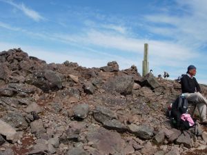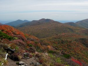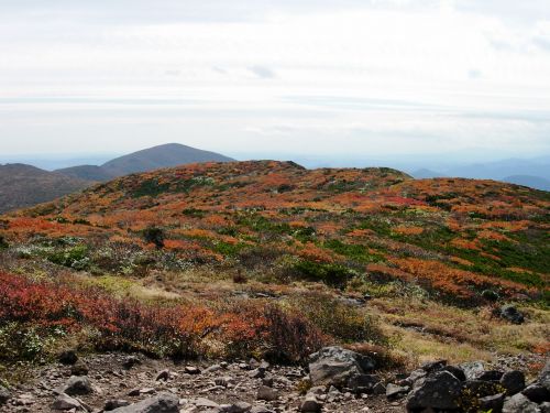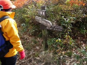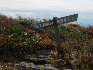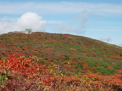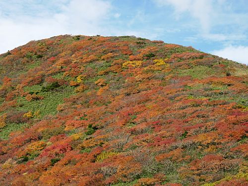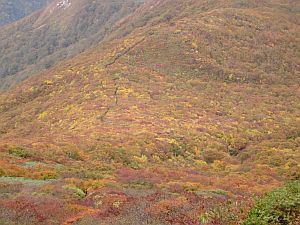 | 9:25 標高1,310m 展望台通過。 ここはちょっとした休憩所になっています。山頂まで0.6kmの道標有り。 2名程度休憩できそうです。 9:50 標高1.465m。尾花沢コース分岐到着。 山頂まで3kmの道標有り。 色麻小野田コース,尾花沢コースの道標有り。 ここから山頂に向かわず,尾花沢コースに少し進んでみると,素晴らしい紅葉が広がっていました。 船形山山腹,尾花沢コース方面など全山紅葉です。 ここで写真を何枚も撮りました。風が強くてかなり寒かったけど,我慢して写真を撮りました。 ![]() 尾花沢コース方向です。登山道がくっきり見えます。 遠くに鳥海山が見えていました。 9:55 出発。 写真撮影で5分ロス。 あと300mの登山道はブッシュ気味ですが,道がしっかり付いています。 10:00 標高1,500m 船形山山頂到着。 休憩。 風がかなり強いですが,小屋に入らず休憩を取っている人達が結構います。よく我慢できるものです。私はたまらず小屋に入りました。 ところが小屋内には10人弱の人が休憩し,その中の男性2名が煙草を吸っています。一瞬小屋内で休憩するか迷いましたが,寒さには勝てないので我慢することにしました。 そのあと入ってきた男性登山者も煙草を吸い始めました。3人で一斉に煙草を吸うので小屋内がかなり煙い状態でした。 休憩中に二人で甘酒やコーヒーを飲みました。他におにぎり,小キュウリの味噌漬けなどを食べました。長野県の小キュウリの味噌漬けはかなりいいです。 ![]() 山頂です。蛇ヶ岳方向から見上げています。 ![]() 山頂から蛇ヶ岳方向を展望しています。この紅葉の中を進みます。 10:55 船形山山頂出発。 休憩時間55分。 小屋内で煙草を飲んでいる人がいたので,小屋から出てきたら体が煙草のヤニ臭かった。 山頂を下るとすぐに観音寺コースと泉ヶ岳・後白髭山(うしろしらひげやま)コースの分岐です。ここから泉ヶ岳・白髭山コースに向かいます。 ![]() 観音寺と升沢,泉・後白髭コース分岐。 分岐から山頂方向展望。 この分岐からハイ松の中を進むような感じになっています。道はハッキリ付いていますが先行き心配です。少し進むと道が斜め左右に分岐しています。右に道を撮ったら崖ギリギリのコースになっていて,風が強いので心配でした。我々が進む方角からから登山者が来ました。左側のコースを歩いています。我々はいったん戻って左のコースを進むことにしました。こちらのコースはハイ松の中を進むので,風にも当たらず歩きやすいコースです。今日のように風が強い時は,左側に進むのが正解のコースでした。 ![]() 蛇ヶ岳方向を展望しています。 船形山から下る途中で振り返ると,船形山全山が紅葉に包まれていました。 ![]() 11:20 千畳敷到着。 船形山山頂から急下降をしてきたところに分岐があります。 千畳敷となっていますが,回り一面背丈より高いハイ松と笹です。 旗坂登山口6.8km,山頂0.7km,後白髭山4.6kmの道標有り。 ![]() 千畳敷の看板です。 11:23 出発。 地形図確認でロス3分。 この分岐を右折し,蛇ヶ岳を目指して後白髭山コースへ向かいます。 蛇ヶ岳手前のコブに登る所から振り返っても船形山が紅葉しています。 ![]() 11:40 標高1,365m付近。 羽毛拾い。 蛇ヶ岳手前のコブを下っていたら,黒と黄色模様の風切羽が多数落ちていたので拾い集めました。まだ何の羽根か分かりません。 11:45 出発。 羽根拾いで5分ロス。 12:15 標高1,400m 蛇ヶ岳山頂到着。 山頂から立った100mしか下りてきていません。これだけ歩いて立った100mの下降です。と言っても少し登り返しています。 |