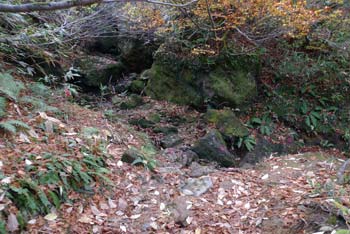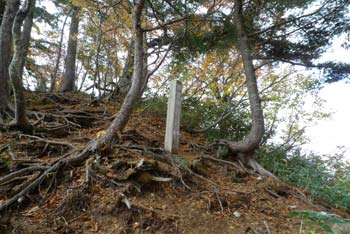 | 6:40 標高555m 高畑キャンプ場駐車場出発。 天候晴れ。風も無し。「今日は気持ちの良い登山ができるかな。」 写真手前が駐車場になっています。登山口は林道を左に進んで間もなくあります。 ![]() 駐車場から100m余り舗装道路を歩いたら,登山口があります。 30番の標識が設置されています。 我々が付いた時には登山者の車が全然ありません。 旗坂キャンプ場周辺はほとんど紅葉していません。 標高690m ツキヨタケ若菌(毒きのこ)群生。 ブナの枯れ木にツキヨタケ若菌が群生しています。毒きのこでなければ大喜びのところです。ぱっと見ではツキヨタケに見えません。ツキヨタケのヒダ側の柄を見たら,ツキヨタケの特徴がありました。帰りに写真にとって帰ろうと思い,そのまま通過です。(下りでは見つけることができませんでした。) 写真右側の黒く写っている枯れ木にツキヨタケ幼菌が群生していました。 ![]() 7:35 標高755m 写真撮影。 撮影で5分ロス。 7:45 標高790m 一群平到着。休憩。 一群平少し手前でヌメリスギタケ(モドキ?)がありました。 三光の宮2.4km 旗坂キャンプ場0.7kmの道標有り。 7:55 出発。 休憩時間10分。 8:28 標高955m 鳴清水通過。 三光の宮1.2km,山頂4.8km,旗坂キャンプ場2.7km,一群平1.2kmの道標有り。 ![]() 8:50 標高1,055m 写真撮影 休憩。 9:22 出発。 休憩時間32分。 ずいぶん時間を掛けてしまいました。 9:35 標高1,135m 標識15番到着。 休憩。 10分余り歩くと標識15番につきました。休憩します。樹上に15番の標識が取り付けられていました。 9:42 15番出発。 休憩時間7分。 9:43 標高1,180m 三光の宮入口通過。 15番標識のすぐ先が三光の宮入口です。この分岐は休憩できる程の広さがありません。 9:45 標高1,180m 大滝分岐通過。 大滝登山口の分岐もわずか1分程で着きます。 10:12 標高1,230m 不動石通過。 「不動石」の道標有り。ここはいつも通過です。 10:19 標高1,170m 瓶石沢(蛇ヶ岳分岐)通過。 ここは蛇ヶ岳の分岐でもあります。 ![]() 小屋まで0.6km,旗坂キャンプ場5.3kmの道標有り。この瓶石沢はまず見逃すことはないほど,はっきりとした沢ですが,水はほとんど流れて無くて,カレ沢のようです。土石流の跡かもしれません。強い雨の時は注意が必要かも。 10:32 標高1,230m 升沢小屋到着。 休憩。 ![]() トイレを利用しましたが,バイオトイレで使用後にハンドルを回す方式なので,重くて腕が結構疲れました。 10:50 升沢小屋出発。 休憩時間18分。 前日に雨が降っていましたが,沢の水量は例年と変わりません。 30分位遡ってきたでしょうか。いよいよ急登になってきました。沢の詰めです。 沢の詰めが終わり蛇ヶ岳分岐まで緩やかに登ります。ここから船形山山頂と小屋が見えています。時期が良ければ最高の紅葉を眺められるポイントです。でももう終わっていました。ガッカリです。 ![]() 11:42 標高1,425m 蛇ヶ岳分岐通過。 旗坂6.8km,船形山0.7kmの道標有り。 升沢小屋からここまで小休憩を2度で5分取りました。 12:03 標高1,500m 船形山山頂到着 休憩。 ![]() 山頂はやや風が強いもののバッチリ晴れています。モヤがかかっていて遠望は効きませんが,すごくいいです。 升沢小屋で休憩した登山者は山頂はガスっているとの情報でしたが,今は完全に晴れ上がっています。 「紅葉は一週間前に完全に終わったな。枯れ草だ。木には葉っぱもない。」 12:48 標高1,500m 船形山山頂出発。 休憩時間45分。 大滝登山コースで帰ります。 13:35 1,230m 小野田コース分岐通過。 色麻登山口方向に向かいます。道標有り。 途中の登山道はブナ原生林?が紅葉していて,気持ちの良い山歩き中です。 ![]() 13:50 標高 m 眺望所通過。 大滝への道標有り。何の眺望がよいのか見に行きませんでした。 ![]() この辺りの登山道もブナがきれいです。 ![]() 14:20 標高1,040m 湯谷地通過。 道標有り。 ![]() 湯谷地付近も紅葉がきれいです。赤,黄色,薄き緑,茶色などが混じっています。 14:23 標高1,040m 三光の宮分岐到着。 休憩。 ![]() ここはブナの巨木の中に抱かれて,雰囲気が凄く良いところです。上空はザワザワと風が葉を揺らしていますが,ブナの下は風もなく静かに休憩を楽しんでいます。 ![]() 14:35 三光の宮分岐出発。 休憩時間12分 100m余り進むと沢におります。沢を下りたところに極々小さな温泉がわき出ています。硫黄温泉です。よく見ていないと気がつきません。 ![]() この沢を上流(写真右側に)に50m程進むと左側に上る道があります。沢を下りたところでどちらに進むと良いのか迷うところです。 15:20 標高1,170m 大滝分岐通過。 ![]() 15:35 標高1,080m。 休憩。 ここは17番と16番の間位です。 15:45 標高1,085m 出発。 休憩時間10分。 16:26 標高830m 一群平通過。 途中1分間ツキヨタケの撮影をしました。1分間ロス。 ![]() 通過時間不明ですが,旗坂平を通過です。 旗坂登山口まで残り800mです。 ![]() 16:55 標高560m 登山口通過。 駐車場まで間もなくです。駐車場に大型バスが見えています。ツアー登山者には会わなかったので,なんのバスか不思議です。 16:57 標高555m 旗坂キャンプ場到着。 駐車場について