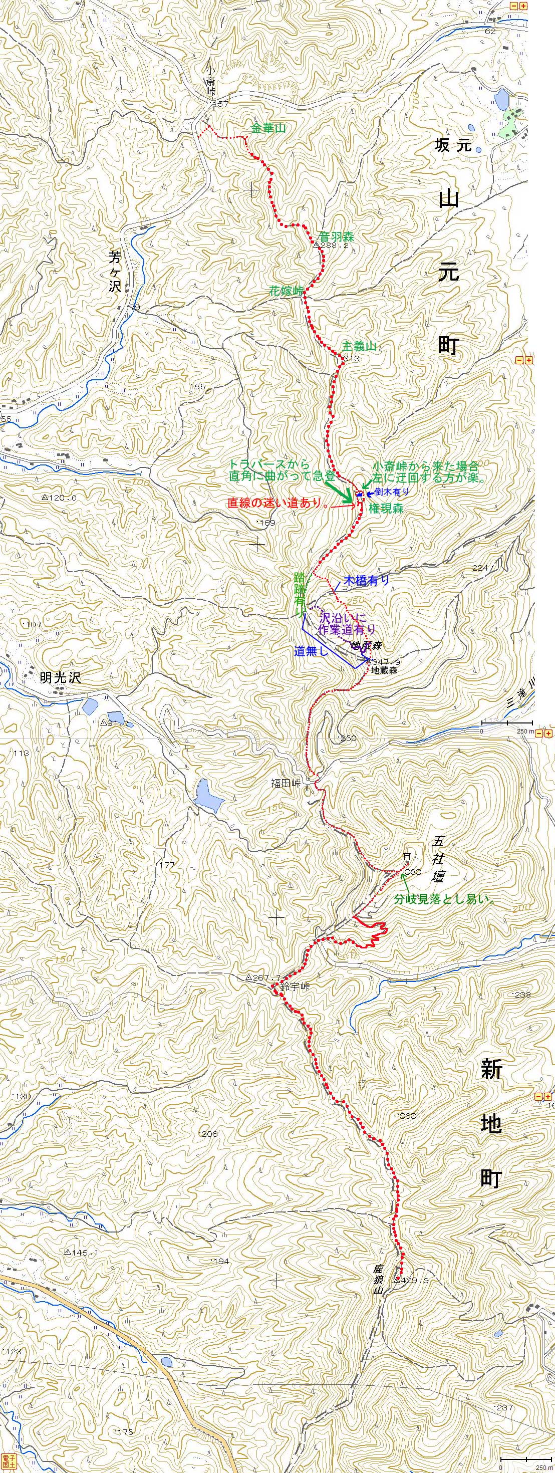 小斎峠→金華山→→権現森→地蔵森→→鹿狼山→鹿狼の湯の地形図です。