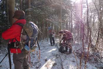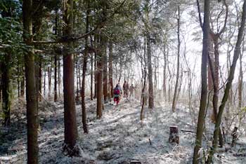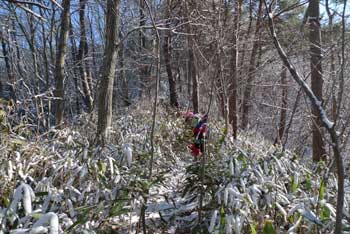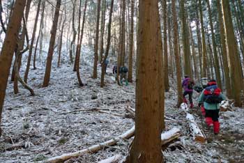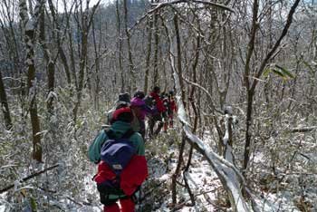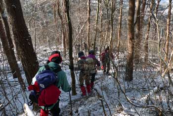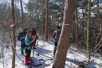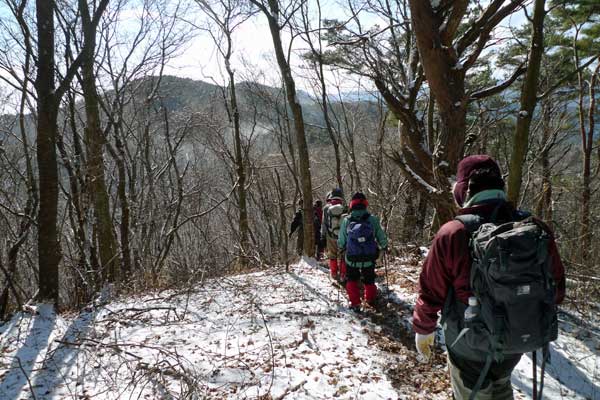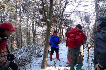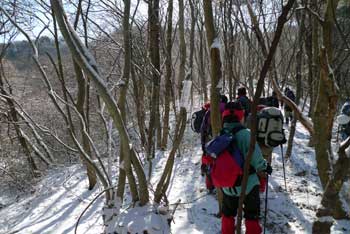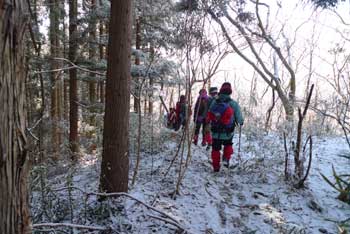 | 小斎峠から鹿狼山への縦走は昨年に続き二度目の挑戦で,昨年は鹿狼山から旧鹿狼温泉へ下山したが,今年は大沢峠への完全縦走を目指した。 前日は夜遅くまで雪が降り続き,登山当日は路面も凍り付く冷え込みの中,雪が10pほど積もっていたが,前日の天気予報で今日は晴れるとのことなので,七十七銀行本店前を予定どおり出発。 登山中はやや強い風に頬をなでられ凍り付く様な冷たさと,登山道はカチカチに凍っている所や,薄く雪が積もっている所で靴底に雪団子が付くなど,歩行にはかなり難儀したが,皆さん苦労しながらも小斎峠→大沢峠を完全縦走踏破した。これは仙台峰友会始まって以来初の快挙となった。 次回は小斎峠から北上か。はたまた亘理町から西山・七峰山から南下か。 |