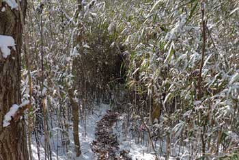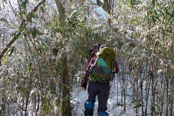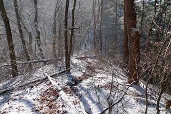 | 9:10 標高157m 小斎峠出発。 駐車場は道路脇に駐車スペースが3台分程有り。 登山口はぱっと見では分かり難くいですねぇ。駐車場から直登します。 ![]() 尾根に出て右に進み,少し登ると小さな石の祠があります。ここから左に進むと「金華山山頂」です。ここは「金華山」と「音羽の森」の分岐です。右に行くと「音羽の森」です。 昨年1月30日(土)撮影写真です。雪が全然ありませんでした。金華山へはこの分岐から30mほど進むと山頂です。 9:23 標高235m 金華山到着。 小斎峠から10数分で到着です。 金華山山頂です。 ![]() 9:25 出発。 休憩時間2分。 30mほど戻って「石の祠」のある分岐から音羽森に向かいます。 金華山→音羽森への登山道です。 ![]() ![]() 9:54 標高285m 音羽森到着。 三角点有り。小さな道標もありました。 ![]() 10:00 音羽森出発。 休憩時間6分。 音羽森→主義山への登山道です。 ![]() この辺は滑るので慎重に下っています。 230m 花嫁峠通過。 音羽森と主義山鞍部の花嫁峠です昔は丸森町と山元町を行き来したのではないかと想像しています。 ここには分岐表示有り。 ![]() 「花嫁峠」とのことなので,角田〜坂本へ花嫁さんが越えて行ったのでしょうか。 ![]() 10:20 標高310m 主義山山頂到着。 ![]() 10:25 主義山山頂出発 休憩時間5分 主義山→権現森への登山道です。 主義山から下るとすぐにササタケのトンネルがあります。ササタケは3m以上あります ![]() ![]() 10:53 標高1,230m 権現森到着。 ![]() 登山靴底には雪団子が沢山付いて歩きにくいです。 ![]() |
