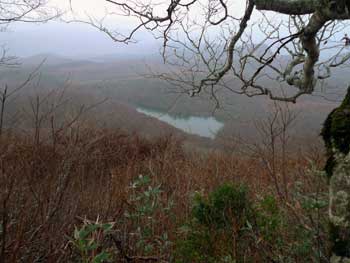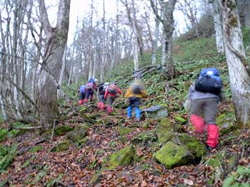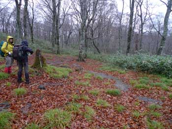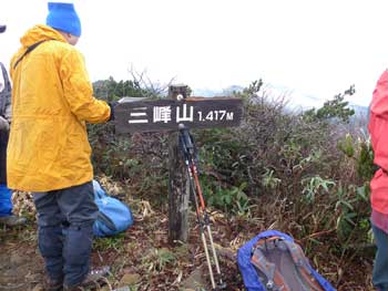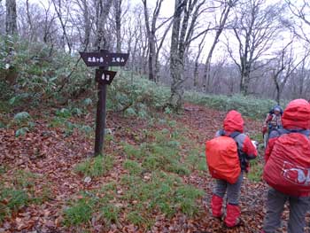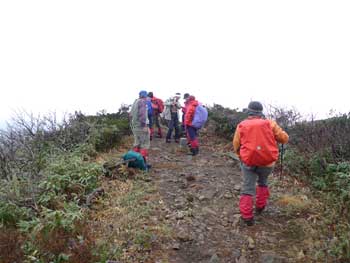 | 6:28 標高790m 登山口出発 霧雨模様のためかなり暗いです。片手でシャッター押したら,写真がぶれてしまいました。 ![]() 登山道はいきなり急登です。 尾根付近ではジグザグに登っていきますが,それでも急登です。 ![]() 6:48 標高925m 尾根到着。 急登の登山道が終わり,尾根に出たので小休止です。 ![]() 6:53 標高925m 出発。 休憩時間5分。 少し小雨模様です。 7:25 標高1,020m 桑沼展望地到着。 小休憩。 ここからは桑沼がきれいに見えます。小休憩によい広場になっています。 ![]() 7:27 出発。 休憩時間2分。 登山道は幅広の緩やかな道を延々と上ってきました。 7:30 標高1,030m 桑沼登山道分岐到着。 小休憩。 事前情報で桑沼からのコースは急登の上付近が崖崩れ状態とのことで,大倉山登山口から登ってきました。桑沼分岐に着くと通行止めになっています。 ![]() 7:32 出発。 休憩時間2分。 緩やかに登る登山道を進んでいると,雨がいっこうに止む様子が無く,むしろ強くなってきたようです。会長から雨具着込みタイムがかかりました。ほとんどの人が雨具の上を着込みました。 7:47 標高1,110m 北泉ヶ岳分岐到着。 ここでまた少しだけ休憩です。相変わらず小雨模様でガスがかかっています。「先が長いのでこの先が思いやられるなぁ。」 ![]() 7:51 北泉ヶ岳分岐出発。 休憩時間4分。 8:15 標高950m 水源到着。 休憩。 北泉ヶ岳分岐から少しの間緩やかに下りましたが,一気に100mの急下降が始まり,鞍部に着いたところが「水源」でした。ここには道標があります。 ![]() ここには水場がありますが,沢水利用になります。 8:22 水源出発。 休憩時間7分。 ブナ林がガスに煙って何となく幻想的です。「皆さんと一緒なのでそう思いますが,一人ではとっても心細くなりそうな雰囲気です。団体登山はこういう時心強いです。」 ![]() 8:30 標高930m 熊の平通過。 少し平らな場所で分岐道らしきものがありました。地形図には記されていません。道ではないのかも。 9:00 標高1,045m 休憩。 周辺はガスでほとんど見通しがありません。 ![]() 9:05 出発。 休憩時間5分。 9:44 標高1,275m。 緩斜面で休憩。 急登を登り切った緩斜面です。「アチーッ!蒸します。」 雨上がりました。「カッパ脱ぐかな」 ここは1,310mピーク(測点)の肩のようです。ここから山頂が見えています。 ![]() 9:55 標高1,275m。 出発。 休憩時間11分。 10:22 標高1,417.6m。 山頂到着。 休憩。 ![]() 楽しい昼食タイムです。皆さん相変わらず沢山食べ物を持ってきています。お裾分けタイムでのんびり昼食できないくらいです。 この寒い中,缶ビールを持ってきた人もいます。 |