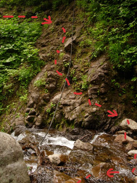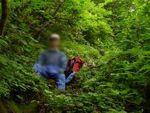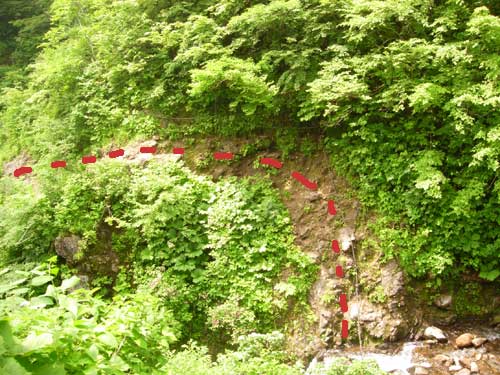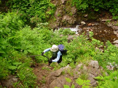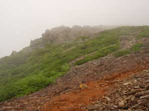 | 9:43 出発 休憩時間13分。 虫が多くて虫除けスプレーを,眼の回りに吹きかけました。眼がチカチカします。 9:50 標高1,240m 一つ目の沢到着。 やっと沢渡渉部に着いたようです。沢の向こう側の登山道が見えません。 良く確認したら沢を渡った後,20m程沢を下る方向に進むと,登山道がありました。 ![]() ここからロープを使ってのヘツリになりました。 さらに,ロープを使っての急下降で沢に下り渡渉です。ちょっと緊張しました。 10:00 標高1,235m 沢渡渉。 やっと沢渡渉が終わりました。赤点線のルートで下りて渡りました。 沢渡渉後に振り返ってヘツリと崖部分を見ています。崖の高さは4m程度です。足場がしっかりしているので,怖がらなければヘツリも崖下降も下りられます。沢渡渉が終わるといきなり急登開始です。 ![]() 10:25 標高1,380m付近 急登の途中で休憩。 ものすごい急登に感じます。「ウ〜ン,急登だ。疲れているなぁ」 急登途中で休憩です。10:31 出発 休憩時間6分。 10:55 標高1,515m ガレ場通過。 急登からいきなりガレ場に出ました。これで急登は終わりでしょうか。 標高差280mの急登でした。疲れてヘロヘロになりました。 ![]() 11:00 標高1,525m。 ガレ場途中で休憩。 このガレ場は休憩を取らないで通過するつもりでしたが,あまりの疲労感で休憩を取りました。「疲れてる〜。心臓がバクバク。音が聞こえてくる」 「正面の岩山が水引入道だろうか。」って,全然違っていました。11:10 出発 休憩時間10分。 ここにタカネイバラ,ベニサラサドウダン,ウスユキソウ(群生)が咲いていました。 花撮影で5分ロス。 ジャンボリーと沢コース分岐にチシマギキョウありました。初めて見ました。嬉しいです。 花撮影で更に5分ロス。 11:28 標高1,555m ジャンボリーコース,沢コース分岐通過。 ![]() 岩山通過中にコケモモあり撮影で5分ロス。 水引入道でハクサンシャクナゲ,マルバシモツケ,ゴゼンタチバナ(群生),ツマトリソウ,コマイヅルソウ,ガクウラジロヨウラク。さらに進むとコバイケイソウありました。アカモノ,ハクサンチドリありました。 12:05 標高1,580m 水引平通過。 屏風岳0.5km,白石スキー場7.3kmの道標あり。 ![]() チングルマ終わっています。ガックリ。花全部終わっていました。 ワタスゲだけありました。ここからまたまた急登です。 12:40 標高1,755m。 屏風岳・水引入道分岐通過。 ![]() 今から南屏風に行って休憩します。「疲れた〜。ほんと疲れたぁ〜」 スキー場7.8km,南屏風岳1,1km,屏風岳0.4kmの道標あり。 「ここまで7.8kmもあったのか。登りではきついはずだぁ」 ここまでの急登で私の右太ももが攣りました。初めての経験です。ストックを使用して負荷を軽減したので,なんとか治まりました。かなりやばかったです。 痙攣が治まったので,ストックをしまいました。事なきを得てやれやれですが,この先が心配です。 13:15 標高1,810m 南屏風岳到着。 休憩。 ![]() 「休憩だぁ。長かったぁ」 カップ春雨,パイナップル,トマト,メカブ海苔巻きを食べました。 13:48 出発。 休憩時間33分。 いよいよ下山出発です。「足ガクガクだ」 振り返って南屏風岳を展望しています。左奥です。鞍部でミヤマカラマツ,カラマツソウ,ミヤマキンバイ,タカネイバラ,ハクサンチドリ,ムシトリスミレ,ウスユキソウ,チシマゼキショウ,ムカゴトラノオ ハクサンイチゲ,マルバシモツケがありました。 不忘山登りにかかる鞍部で小雨っぽい感じです。「急がねば。」 やばいです。また太ももがピクピクしています。痙攣までいかずに済みました。 ![]() 14:38 標高1,705.3m。 不忘山通過。 雨粒が大きくなってきたので,雨具を着るか迷っています。不忘の碑まで行って休憩を取りたいので,そこで雨具を着ることにしました。 不忘山の山頂を少し下りたところに,草に隠れるようにしてオノエランがありました。パートナーが見つけました。すごいです。さすがです。 14:50 標高1,635m 不忘の碑到着。 休憩。 不忘の碑に到着したら,途端に雨脚が強くなりました。雨具を大急ぎで着込みました。不忘の碑の下で,コーヒーを飲んで休憩を取りました。カップの中に雨水が入ります。 15:10 不忘の碑出発。 休憩時間20分。 「大雨だ。」 ここで再びストックを使い始めました。パートナーと私それぞれ1本ずつで使用です。 この先,白石高校山小屋跡までドロドロの滑る登山道になっていて,ストックがなければ駐車場まで更に時間がかかったと思います。 途中トキソウがいくつも咲いていましたたが,雨と疲れで写真を撮る気になれませんでした。「カメラがザックに入っているからなぁ」と弁解しつつ下りてきました。「情け無い〜」 15:48 1,350m。 弘法清水到着。休憩。 今は雨が上がったようですが,まだ降りそうです。遠くで雷が鳴り出しました。 トマトを食べ,お茶飲みました。 15:55 弘法清水出発 休憩時間7分。 16:48 出発。 標高1,115m 白石小屋跡通過。 雨が相変わらずジャンジャン降っています。 17:05 標高905m 無料休憩所到着。 トイレ休憩。 ほぼ雨が上がりました。 17:13 出発 休憩時