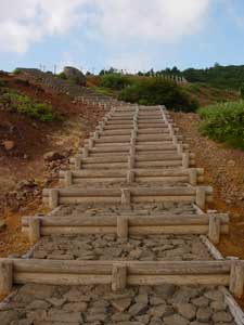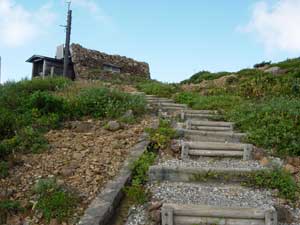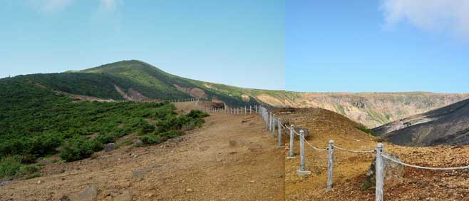 8:50 標高1,410m 大黒天駐車場登山口出発。 いきなりこんな感じの階段登りです。今日の日差しはとても暑いです。長袖夏シャツの下がすでに汗だくです。訓練登山と思い最初からペースをあげてみたのですが,とても暑くて堪えてしまいました。 ヤマハハコ,ヒヨドリソウ,エゾオヤマノリンドウがありました。ヤマハハコは満開,ヒヨドリソウは終わりかけです。 五色岳と奥に熊野岳が見えます。相変わらず階段登山道が続きます。 今度は石段です。9:02 標高1,500m 刈田岳山頂展望地通過。 ここから刈田岳山頂の刈田峰神社が見えます。 ![]() 上写真は刈田岳と熊野岳に続く尾根です。 屏風岳(南蔵王)方向の展望です。9:15 標高1,570m 剣が峰通過。 「剣が峰」があることを初めて知りました。ここから熊野岳が見えます。 ![]() 上写真の中心左奥が熊野岳で,右半分手前が五色岳です。お釜も半分ほど見えています。 ウグイスでしょうか。ジャッジャッと地鳴きが聞こえます。 シロバナトウウチソウもありました。すでに花は終わっています。 お釜付近を登山者が数名(2〜3名)歩いているのが見えます。 9:30 標高1,675m 刈田避難小屋通過。 ここからは屏風岳が間近に見られます。登山道も前山にハッキリと見て取れます。 この避難小屋の当たりは風が通って涼しい感じです。アマツバメが飛んでいました。9:33 標高1,758m 刈田峰神社到着。 通過。 刈田岳から熊野岳に向かうつもりでしたが,お釜に下りて五色岳を目指してみます。こんな良い天気は滅多にないと思うので。 左側に柱が写っていますが,鳥居です。9:36 標高1,730m付近。 駐車場と熊野岳とお釜の分岐通過。 ここからお釜の方に進みます。 9:44 標高1,680m お釜への入り口通過。 休憩。 ![]() 上左写真は分かりにくいですが,草原状に見えるところに,遊歩道が整備されています。 右写真はお釜へ下りた個所です。一部ロープ張りの手摺りになっているところから,尾根伝いに下りてみます。 五色岳山頂付近に登山者が数名歩いているのが見えます。先ほどお釜付近を歩いていた登山者でしょうか。 出発から1時間たったので,ロープを越えて30mほど進んだところで休憩です。 ![]() 上記赤いラインで進みました。点線になっているところは,裏側に回り込んで歩いたところです。 |