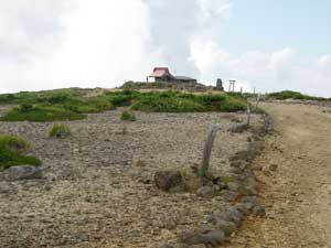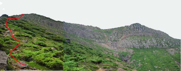 | 9:53 出発。 休憩時間9分。 足元のガレが脆くて歩きにくいです。踏み跡もハッキリしないので,ここを下りるのが正解なのか不安に思いながら下りていきました。 10:10 お釜の縁到着。 ![]() 振り返ると刈田峰神社が見えています。 ここは右回りで進んでみます。 上から見た時にお釜からの登りは,かなりの急斜面に見えましたが,お釜の縁まで来てみると,さほどの急斜面ではないように見えます。 大黒天側の方に雲が出てきました。雨やガスが心配です。 五色岳へは右側沿いに尾根が続いているので,そこを登るのが正解のような気もしましたが,刈田岳から見た時には,崖が切れ落ちているようにも見えたので,内側からしばらく進み,尾根に登り出ました。 足元はかなり脆くて崩れ落ち非常に歩きにくいガレ場です。ガレというよりザレ場です。 尾根に出てからの右側は,えぐれるように切れ落ちているのが見えるので,気持ち悪くて尾根頂部を歩けません。少し下がって歩きました。 10:33 標高1,675m 五色岳山頂到着。通過。 写真を数枚撮って下降開始です。 ![]() 上写真は五色岳から撮ったもので,左端が刈田岳,右端が熊野岳です。 山頂と言ってもどこにも標識がありません。刈田岳から見てお釜の背景にある一番高そうな場所を,山頂としました。合っているかどうか分かりません。 下降開始しましたが,ここは左側がお釜になっていて,尾根下がえぐれているのが見えるので,右回りに下降しました。 お釜の縁を左回りに進んで,刈田岳からの下り口に戻るか,ここから見えるロバの耳岩鞍部の上に有る標識を目指すか,迷いながら下りました。初めは元の下り口に戻るつもりでしたが,振り子沢源頭まで下りたら,振り子沢方向に踏み跡らしきものが見えます。 「どうしましょう,ロバの耳に行くのか。行く気配です。大丈夫か」自問自答を繰り返しました。 結局,ロバの耳岩鞍部を目指すことにしました。 五色岳を下降し終わったところには,コマクサの名残が咲いていました。 ここから,振り子沢を下るのではなく,水平移動若しくは登り気味にトラバースしながら進みました。途中,小さな沢状にえぐれた所を乗越し,少しずつ高度を稼ぎながら進んでみました。そのうちに,足元の岩(石)がもろく崩れそうなところが沢山出てきました。手で掴む石もかなり浮いている石が多くなりました。 途中でつかむ石,踏む石全てが崩れ落ちる状態になったので,さすがに危ないとお思い後退し,別ルートを探して進みました。 11:12 標高1,635m ロバの耳岩鞍部到着。休憩。 「いっやぁ,すげかった。休憩だ」蔵王岳とロバの耳岩の道標有り。 お釜下り口付近で休憩を取ってから,1時間19分でしたが,2時間位歩いたような,精神的疲れがあります。 振り子沢源頭からロバの耳岩鞍部までは,コメントも写真も撮る余裕がまったくありませんでした。写真を撮ることをすっかり忘れていました。 ![]() 上の写真は刈田岳から振り子沢源頭まで歩いたルートです。このロバの耳岩鞍部の下が急峻な崖になっています。そこを登ってきました。 11:22 出発。 休憩時間10分。 ここから先も急峻な大岩の崖登りに見えます。ただ,この先は赤テープや岩に目印ペンキが付いているので,迷わないで行けそうです。 「のんびり行こう,のんびりだ!」 ![]() 11:40 標高1,745m。 お釜と熊野岳分岐通過。 お釜・刈田岳,熊野岳,ロバの耳岩の道標有り。 ここからは周辺の山が全部見えます。緩やかな広場状になっていて,ここまで来たらホッとしました。「やれやれ」です。心に余裕が生まれてくるのが分かりました。 イワヒバリに遭遇です。11:58 標高1,830m 名号峰分岐通過。 熊野岳,名号峰,ロバの耳岩分岐になっていて道標有り。 ここにロバの耳岩コースは岩が脆くなっているので,通行禁止の立て看板がありました。 ![]() ![]() 熊野岳避難小屋です。 地蔵山方向展望です。 熊野神社が見えてきました。12:09 標高1,845m。 熊野岳到着。 休憩。 登山者がいっぱいいます。ガヤガヤしています。 休憩中に丸山方面から黒雲が湧きだしています。地蔵山方向は青空が見えています。なんか雷が鳴り出しそうな雲行きです。 地蔵山には向かわず急ぎ戻ることにします。パンとおにぎりを各1個食べました。 12:21 出発 休憩時間12分。 食事もそこそこにすぐに出発です。 13:00 標高1,758m 刈田岳山頂到着。 休憩。 この刈田峰神社に上る階段で,太ももの内側が攣りそうになりました。以前,水引入道から屏風岳への登りで,一瞬攣った個所なので,今後癖にならないか心配です。巻機山では症状が出なかったので,安心していたのにまた出てきました。 12:10 標高1,580m 刈田岳出発 休憩時間10分。 「ハ〜,あと1時間弱ですかね」 刈田峰神社の前方50mほどの所に碑があり,ここから南蔵王縦走コースと大黒天の分岐になっています。分岐の道標がありました。 下降途中に背中の方で,ジャァ,ジャァと鳴き声がします。カケスにしては若干鳴き声が違います。ふり向いてみると木の上でホシガラスが鳴いていました。写真を撮ろうとした