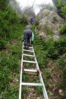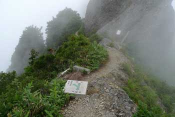 | 13:40 入道岳出発。 休憩時間17分。 少しゆっくりと行動食を摂りました。 14:05 迂回路分岐通過。 迂回路の写真撮影。 ![]() 14:07 迂回路出発。 休憩時間2分。 いきなりアルミ梯子の下降でかなり長いです。でも下りなのでほとんど疲れることはありません。もしこれが登りだったら相当疲れることでしょう。しかも,この長〜い梯子が終わっても,さらに下りが続きます。「迂回路なのにこんなに下るのだろうか」と思う頃に迂回路のトラバースになります。 ![]() 14:23 標高1,665m 新開道分岐通過。 この辺りから登山道は八つ峰分岐(地蔵岳分岐)までトラバース気味に進みます。ところによっては足場の狭い鎖場の分岐が続くところもあります。 14:30 標高1,675m 八つ峰分岐到着。 休憩。 通過するつもりでしたが休憩を取ることにしました。 ![]() 休憩中にご夫婦が一組通過していきました。 近くに「月の池」がありました。大正7年に建てた鋳物柱がありました。 ![]() ![]() ![]() 14:39 分岐出発。 休憩時間9分。 迂回路がすっかりガスに覆われてきました。ここは水平移動の鎖場で,登山道は片足幅分しかありませんでした。 ![]() 15:05 標高1,650m 八つ峰分岐通過。 やっと来ました。 ここまでトラバースの連続で結構緊張しました。 千本檜小屋が見えてきました。 ![]() 15:13 千本檜小屋到着。 ロープウエイ山頂駅最終出発時間が,17:00なので,急げばギリギリ間に合いそうです。 小屋番さんに小屋泊をキャンセルし,2階に置いてあった荷物をザックに入れ,大急ぎで出発です。昌子は大きなザックに置いてあった荷物は既に入っています。背負っていた小さな荷物を入れてすぐに出発できる体勢です。和昭は小屋に上がる為登山靴を脱いでいたので,靴紐をしめる時間と,置いてあった荷物をザックに入れるのに少し時間がかかります。昌子には先に出発してもらいました。和昭はストックを使用して追いつくつもりです。 15:20 千本檜小屋出発。 休憩時間7分。 昌子から約4分遅れで出発です。 15:51 標高1,390m 女人堂到着。 休憩。 15:56 女人堂出発。 休憩時間5分。 16:25 標高1,240m 大倉口への分岐(四合半)通過。 「里宮まで1時間50分」の道標有り。ロープウエイ乗り場まで20分の道標有り。 16;40 標高1,180m ロープウエイ山頂駅到着。 16時40分発のロープウエイにぴったりでした。乗り場案内人が我々を見ていたので,最後50mくらいは小走りで行きました。乗車券をその場で購入し,約1分遅れで出発です。 17:10 標高410m ロープウエイ売店出発。 ここから屏風道登山口まで車道歩きです。 長いです。ほんとに長いです。でも,車道歩きの間ず〜っと八つ峰が見えます。だんだん陰っていく八海山を見ながら歩いたので,退屈はしませんでした。 駐車場から八つ峰を展望です。 ![]() だんだん日が陰ってきました。 ![]() 17:58 標高495m 屏風道登山口到着。 「やれやれだぜ。」 車道歩きは長いです。 |