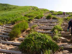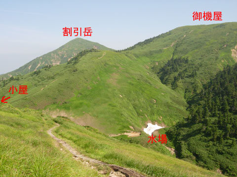 5:10 標高740m 桜坂駐車場登山口出発![]() 起床から出発まで,今日も2時間かかってしまいました。「どこかで30分短縮することが考えねば。」 登山口から50m程進むと割引岳(わりめきだけ)へ直登するヌクビ沢との分岐を通過します。ここは右コースの井戸尾根コースへ進みます。分岐道標があります。 ピンボケ写真です(^ ^;この分岐から少し進んだら,男性二人組(関西系)から「登山道はここで良いか」と聞かれたので,「自分たちも初めてなのでよく分からない。たぶんここで良いと思う」と答えました。正直このような質問は困ります。自信を持って進んでいますが,万が一間違えていたら責任もてないので。 6:13 標高1,100m 五合目到着。 休憩。 ちょうど1時間で着きました。 ここは少し開けた場所になっています。ここからは巻機山はまだ見えません。 石がゴロゴロしていて坐る場所には困らないところです。20人前後は休憩できます。 なんか左踵が痛いです。キネシオテープを三重に貼っているのにずいぶん痛みがあります。 6:24 五合目出発。 休憩時間11分。 雲が切れてきました。山の陰からちょうどお日様が出てきました。 日の出です。当たり前ですが,山の日の出は遅いです。風も全然ありません。暑くなりそうです。早め出発で正解でした。 五合目を出発したらすぐに左側がブナの若林です。すごく綺麗なブナ林です。 ![]() 7:00 標高1,330m 六合目到着。 ここは「六合目展望地」の道標がありました。ここでヌクビ沢と割引岳の写真を撮りました。 急峻な登山コースです。我々にはとても登れそうにないルートです。7:02 出発。 写真撮影で2分ロス。 7:37 標高1,535m 七合目到着。 休憩。 ![]() ここはガレの広場になっています。かなり広くて50人は楽に休憩できそうです。 ブドウ,パイン,もち1個を食べました。 7:50 出発。 休憩時間12分。 ここまでにツルリンドウ,七合目付近にノギラン,キンコウカ,イソツツジがありました。 8:20 標高1,715m 八合目通過。 この辺の登山道は階段状に整備されています。休憩場所にも困らないところです。 ![]() ここからニセ巻機山が見えます。やっと見えてきたとの思いです。 ここにはイワショウブがありました。写真を撮っていたらご夫婦の方から「何の花ですか」と聞かれ,「たぶんチシマゼキショウと思います。自信がないんですが」と答えました。チシマゼキショウに思えたのですが,イワショウブでした。「たぶん,思います,自信がない」って付け加えておいて良かったです。(^_^; イワショウブはこの先至る所にありました。 ここで写真を撮って5分ロス。 8:43 標高1,810m ニセ巻機山(九合目)到着。通過。 道標がありました。ここで写真を撮って避難小屋のある鞍部に向かって出発です。 8:45 出発。 写真撮影で2分ロス。 避難小屋に向かって木道を下降です。ちょっと滑るので緊張しました。 遠方は割引岳です。 ニセ巻機山から下る途中での展望です。8:55 標高1,750m 巻機山避難小屋到着 休憩。 ![]() 室内は綺麗です。止まってみたい雰囲気の小屋です。 トイレも綺麗ですがトイレットペーパーがありませんので持ってくる必要があります。トイレが2室しかないので,結構待たされました。 トイレを待っている間に踵を見てみました。キネシオテープ3枚はしっかり貼られていますが,すごい痛みがあります。はがしてみると,踵の皮が1p×3pの長方形にベロリと剥けて無くなっていました。ひどい状態です。どうやら,キネシオテープを貼ったときに,踵を最大限に曲げ伸ばした状態で貼らなかったために,歩きで踵を曲げ伸ばしたときに,キネシオテープの接着力が強すぎて,皮が引っ張られて剥けてしまったようです。今度は踵をしっかり伸ばした状態で,キネシオテープを3層に貼ってみました。ところが皮が剥けてしまっているので,上からさすると痛みがあります。幸いキネシオテープをたくさん持っていったので,5層に貼ってみたところ痛みが感じなくなり登山を続け,その後は無事下山することが出来ました。 オヤマリンドウ,タテヤマリンドウ,イワイチョウ,ニッコウキスゲがありました。 9:15 避難小屋出発 休憩時間20分。 9:35 標高1,960m 御機屋(御機屋)到着。 通過。 ここには「巻機山山頂」の道標があります。巻機山最高点へは右に進みます。 ![]() 我々は割引岳(わりめきだけ)に行くために左方向に進みます。右写真が三角山が割引岳です。 すぐに木道の下りになります。急傾斜に木道が設置されているので,かなり慎重に下りないと滑ります。 9:40 標高1,845m 御機屋から少し下ったところで休憩。 私があまりに腹が減って急遽休憩です。 9:53 標高1,845mから出発 休憩時間13分。 トラバースしながら割引岳(わりめきだけ)に進みます。トラバースが終わると割引岳が眼前に見えてきます。 ![]() ハクサンコザクラ,タテヤマリンドウ,イワカガミ,オトギリソウありました。オトギリソウは下の方でも見かけました。 10:26 標高1,930.9m 割引岳山頂到着。休憩。 ![]() 途中花撮影で5分ロス。ハクサンコザクラとタテヤマリンド