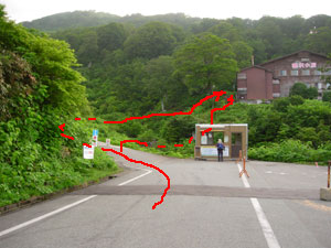 登山口までのアプローチ; 国道112号線を進み,県道114号線を登っていくと,行き止まりの姥沢小屋に到着する。 |