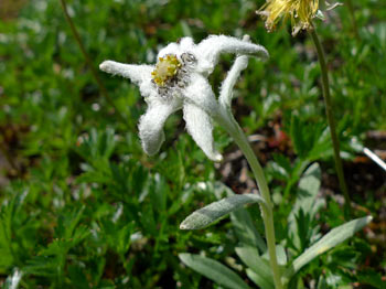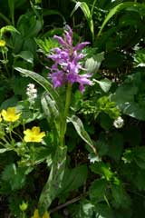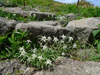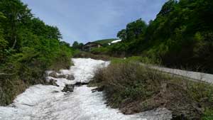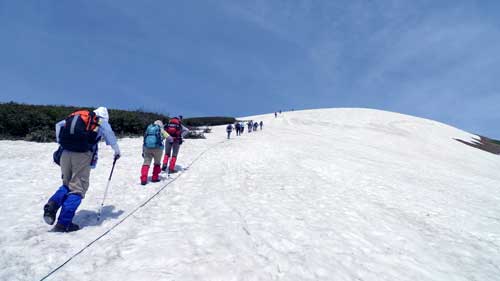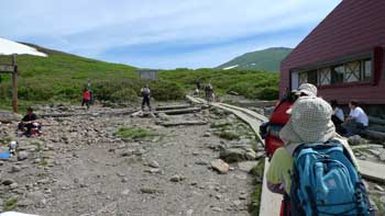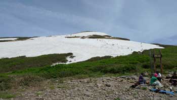 | 6:50 仙台宿舎出発。 Kさんの車で住まいを出発。 8:45 駐車場出発。 駐車場は到着時に三分の二以上埋まっていました。ジリジリと日差しが暑いです。 8:50 標高1,150m トイレ場所から出発 リフト乗り場までの車道歩きでノウゴウイチゴがありました。 リフト乗り場が見えています。 ![]() 月山のリフト乗り場にはイワツバメがいくつもの巣を作っています。「頑張っているなぁ」 月山リフト乗り場にもトイレ有りました。 9:05 標高1,240m リフト乗車。 ペアリフトに乗っていよいよ出発です。Kさんと私は単独です。パートナーとKNさんがペアで乗りました。 ![]() リフト下にはノビネチドリ,ハクサンチドリ,ニッコウキスゲ,チングルマ,ツバメオモト,マイヅルソウがありました。「さすがに月山は凄いなぁ」 ![]() 9:20 標高1,550m リフト終点到着。 ![]() 9:20 標高1,550m リフト終点出発。 姥が岳に向かって出発します。姥が岳にはかなりの残雪があり,スキーヤーが練習しています。ボーダーもいます。下記写真雪渓の右端を登ります。 ![]() リフト終点駅を出発するとすぐに雪渓歩きが始まります。雪が溶けて比較的登りやすい感じでした。 ![]() 9:38 標高 m。 雪渓通過完了。 雪渓が終わると石畳の階段を上り,なだらかな斜面になりました。 「暑い!雪渓終わると暑い!ジリジリとくる。」 ヒナザクラ,イワカガミ,チングルマ,ミツガシワありました。花がいっぱい咲いています。チングルマは意外に黄色が強く,イワカガミの赤と他植物の緑がコントラストをなし,華やかな雰囲気のお花畑になっています。 ヒナザクラは登山中に1本だけでした。 9:45 標高1,669.7m 姥が岳山頂到着。 休憩。 ![]() 鳥海山,朝日岳連峰がバッチリと見えます。素晴らしい天気です。 ![]() 10:00 姥が岳出発。 休憩時間12分。 周辺にはミヤマウスユキソウやウズラバハクサンチドリ,コバイケソウが咲いています。写真に撮りました。 左がウズラバハクサンチドリで右がミヤマウスユキソウです。 ![]() 少し歩き出すとシラネアオイ,ハクサンイチゲ,ショウジョウバカマ,ツマトリソウ,ミヤマキンバイありました。ミヤマキンバイは群生して,今が盛りと咲いています。奇麗です。右手奥にこれから向かう月山山頂が見えています。雪渓を横切るように進みます。 ![]() 石畳の登山道にはミヤマウスユキソウが競うように咲いていました。登山道がまるで花壇のようです。 ![]() 10:13 標高1,625m 湯殿山分岐通過。 ここは二つの小ピークの鞍部になっています。 カラマツソウかミヤマカラマツがありました。 10:23 標高1,675m バイカオウレンありました。 こっからしばらく雪渓歩きです。と思ったら,すぐに雪渓が切れました。その奥の雪渓と重なっていたので,ずーっと奥まで雪渓が続いているように見えました。 牛首の手前にアオノツガザクラがありました。コメバツガザクラかと思ったら訂正されました。葉の形がツガの形でした。コメバツガザクラは葉の形が米の形をしています。 10:45 標高1,725m 牛首付近で休憩。 残雪が多くて牛首分岐道標が見えません。この辺が分岐のはずです。 雪渓の中を歩いていると,眩しくて涙目になりました。サングラスを持ってくることまで,考えが至りませんでした。振り返って牛首分岐方向を撮影しました。 ![]() 10:53 出発。 休憩時間8分。 ミヤマハタザオありました。ハクサンハタザオかもしれません。 11:00 標高1,750m 雪渓通過中。 少し急な雪渓になっています。 ![]() 標高1,795m付近 小休止。 雪渓終わったところで小休止取りました。休憩時間3分。 11:32 標高1,925m 鍛冶稲荷神社跡地到着 休憩。 ここにはミヤマガラシがいっぱい咲いています。 11:40 鍛冶神社跡地出発。 休憩時間8分。 月山広場手前の最後の急登です。この辺が道中一番の急登です。短いのでゆっくり登るとすぐに緩斜面にでられます。 ![]() 鍛冶神社からの急登を登り切ると緩斜面になり,いよいよ山頂神社が見えてきました。ポッコリ飛び出ている上に神社があります。右下の蒲鉾状の建物は避難小屋です。 ![]() 「さてさて,目当てのクロユリは何処かなぁ」と言いつつ水平移動の登山道を歩いていたら,ありましたぁ。登山道脇のヤブの中にジミーな色合いで,遠慮深げに咲いています。早速写真に撮りましたが,パートナーに声をかけられ,気がつくとKさんとKNさんが,暇そうに佇んでいました。夢中になって皆さんのことを忘れていました。「反省!」です。 ![]() 11:55 標高1,970m 月山山頂広場到着。 神社の右脇を抜けて三角点を目指します。我々は神社脇からすぐに尾根に上がってしまいましたが,尾根下をトラバースしながら進むと三角点にでられます。帰りはトラバースで広場まで戻りました。 12:00 標高1,979.5m。 月山三角点到着。 写真を撮りました。仏生池コースを撮りました。奥に鳥海山が見えています。 ![]() ![]() |