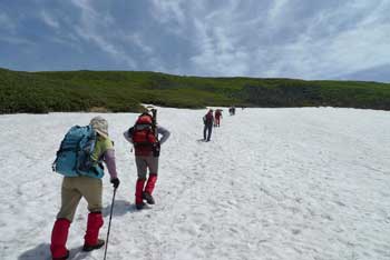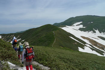 | 7月10日(土)の峰友会月山山行のため,4名で月山に下見登山に行ってきた。 Kさんに車を出してもらい,行き帰りの運転を全てKさんにお願いした。お世話になりました。 さて,下見山行のこの日は好天で,周辺の展望に恵まれ,大朝日連峰と鳥海山がクッキリと見られた。パートナーと私が密かに期待していたクロユリも,月山神社広場下の登山道でいくつも見られ,大満足となった。 登山道には残雪が多く,姥が岳への登り,牛首手前から鍛冶神社下までの上り下り,牛首から姥沢小屋へ至る下りに多くの残雪があった。 特に標高1,350m−1,225mは急斜面を横切る雪渓トラバースがあり,滑落すると大けがは免れない状況だったので,かなり緊張した。帰宅後は太腿やふくらはぎに疲労感があった。 この急斜面を横切る雪渓トラバースの沢コースは,帰宅後にリフト出札口に張り紙がしてあり,「沢コースは閉鎖」となっていた。 念願だったクロユリは月山山頂広場手前の緩斜面を歩いていたら,登山道脇で呆気ない程簡単に見つけることができ,少し拍子抜けだった。 花の種類は少なかったが,ウズラバハクサンチドリ,ミヤマウスユキソウ,クロユリを十分に堪能することができたので,満足感は十分にあった。 |