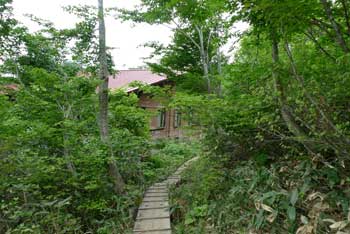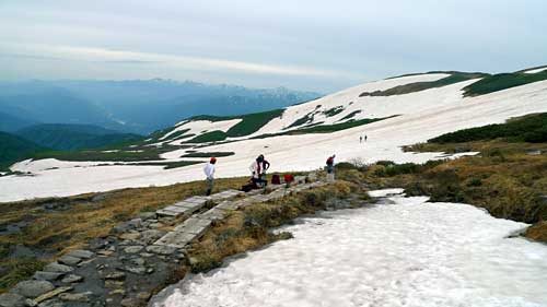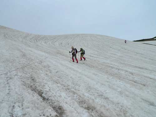 | 12:03 出発。 休憩時間3分。 12:09 標高1,970m付近。 月山広場に到着。 休憩。 Kさんがビール2缶持ってきていました。ビールをカップ1杯飲みました。 Kさんは他に小さなスイカ玉を持ってきてご馳走してくれました。すっごく冷え冷えで,美味しくいただきました。 12:55 出発。 休憩時間46分。 ヨツバシオガマもありました。 13:09 標高1,970m 月山広場下出発。 ![]() 14:00 標高1,520m。 雪渓通過中。 休憩。 沢コースへの下りは長い雪渓下りになります。 ![]() 雪渓が切れて木道のでているところで休憩しました。ここはリフト終点駅分岐を少し過ぎたところです。 ![]() 14:05 出発。 休憩時間5分。 この木道から誘導ロープが雪渓の上に張られているので,ロープ沿いにしばらく進みました。ところがこのロープはリフト終点駅へ導いているようでした。先の方で登りになり方角もリフト終点方向です。 幸いなことに,天気が良くて見通しがあったので,姥沢小屋へ進む方角の木道が下の方に微かに見えました。 検討した結果,姥沢小屋コースへ進むことにしました。ここからは会山行時のリーダー役のKNさんに代わり,私が先頭を歩くことにしました。 木道の見えている方向に雪渓を下りていき,姥沢小屋コースに乗りました。 その先は所々露出している木道を頼りに,姥沢小屋コースを下りていきました。 標高1,250m−1,350mの急斜面トラバースのところには,私が心配したとおり沢状の箇所に雪渓のトラバースがあり,滑落すると50m位は滑り落ちてしまう急斜面でした。 雪渓のトラバースは10m程と短いのですが,滑落すると大けがは免れないと思い,慎重にステップを切りながら歩を進めましたが,かなり緊張を強いられました。 このような雪渓は少なくとも4箇所ありました。 コミヤマカタバミ,ミズバショウありました。ミズバショウは今咲いたばかりです。奇麗です。この近くに最後の急斜面雪渓トラバースがありました。 15:00 標高1,240m リュウキンカありました。 リュウキンカが満開です。オオバミゾホオヅキもありました。 ここまで来るともう雪渓がないはずです。ホッとしました。 しっかりした木道も出てきたので,もう姥沢小屋が近いです。 ![]() 姥沢小屋間近になってきたらズダヤクシュがいっぱいありました。 15:13 標高1,1185m。 姥沢小屋登山口到着。 通過。 ![]() 15:25 標高1,150m 駐車場到着。 トイレ前に着きました。 「いやぁ,素晴らしい。新鮮な花,花*花,山々山,雪渓等々,素晴らしい山行だった。」 |