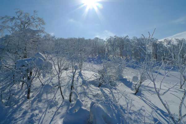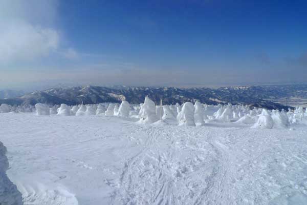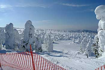 | 蔵王の樹氷を見に行くことになった。蔵王温泉ロープウエイを利用して,地蔵山山頂付近の樹氷原を検討していたが,せっかくパートナー用のスノーシューを購入したので,ライザワールドスキー場リフト終点→刈田岳→ライザワールドスキー場の計画を立てた。 ネットで調べてみたら,それなりに登られているし,ガイド付きツアーもあるようなので,我々二人で行っても踏み跡などがありそうと思った。 山行日前々日にネットで調べていたら,リフト終点から40m間隔で,ガイドポールを立ててあるらしい。これなら十分行けると安心した。後は天気の心配だけだったが,こちらも週間天気予報で曇りだったが,前日になったら山形県・宮城県共に晴れの予報になった。 もう一つ私は密かに心配していたことがあった。ライザワールドスキー場リフト終点からの樹氷見学は,ネットにあまり詳細が載っていないので,蔵王温泉ロープウエイを利用した地蔵山山頂の樹氷原より,かなり落ちるのではないかとの心配があった。 しかし,それは全くの杞憂であった。むしろ登山者が多くて踏み跡がハッキリしすぎて,チョッとガッカリした位だった。また,樹氷は素晴らしくてこちらに来て本当に良かった。 リフト終点からガイド付きツアーの小グループや単独行の人達が準備を整え出発していった。 リフト終点から周辺には樹氷原が広がり,期待感が膨らむ。 登りは40m間隔のガイドポールを頼りに進み,旧夏リフト乗り場まで登ったら,かなりのガスとなり,下山登山者の情報などから刈田岳までは無理の様に思われた。 旧夏リフト沿いに登っていくが,ガスがだんだんと濃くなり,新夏リフト終点まで進んだ所で,パートナーから「戻ろう。登ってきたガイドポールが見えなくなりそう」との意見があり,それに従い撤退することにした。 この撤退場所の50mほど手前で,40人前後のガイド付きツアーの下山者と遭遇。聞いてみたら刈田岳まで行ってきたとのこと。これを聞いていたので,私はあと少し登ってみたかったが,無理しないで撤退すると判断した。後で地形図を見たら,残り100mほどで刈田岳鞍部に着く場所だった。「ちょっとだけ心残りがあるなぁ」 さて,樹氷の方だが,避難小屋から下は青空で見通しも良いので,ガイドポールから外れ,樹氷原に入り下山した。樹氷原内の風景は感動の連続で筆舌に表せない。「来て良かった。素晴らしかった。」 リフト終点付近の車道からは樹氷原が終わりとなった。ゲレンデを下りるのは気が惹けたので,樹林地帯の中を下りた。スキー跡と輪カンジキ跡があったので,それに従い下りた。何度かコンパスで方向を確認しつつ樹林帯を下りたが,右に進めばゲレンデ,左に進めば車道に出る安心感があるので,下りることができた。ただ,左(車道方向)に進むと車道歩きとなり,距離が長くなるので,常に右方向を意識しながら下山した。 無事にライザワールドスキー場ロッジに到着し,ミルクティーを飲んで休憩。 その後,蔵王温泉からロープウエイを利用して,地蔵山山頂の樹氷のライトアップを見るつもりで,現地に到着した。しかし,ロープウエイ料金が二人往復で5000円もかかるのと,リフト終点の建物から出られないことが分かり,狭い範囲のライトアップと理解したので止めて帰宅することにした。 リフト料金は2基乗り継いで600円/人だった。 第1リフトは4人掛けに二人で乗り,第2リフトは二人乗りだったので,私,パートナーそれぞれ一人で乗った。 |